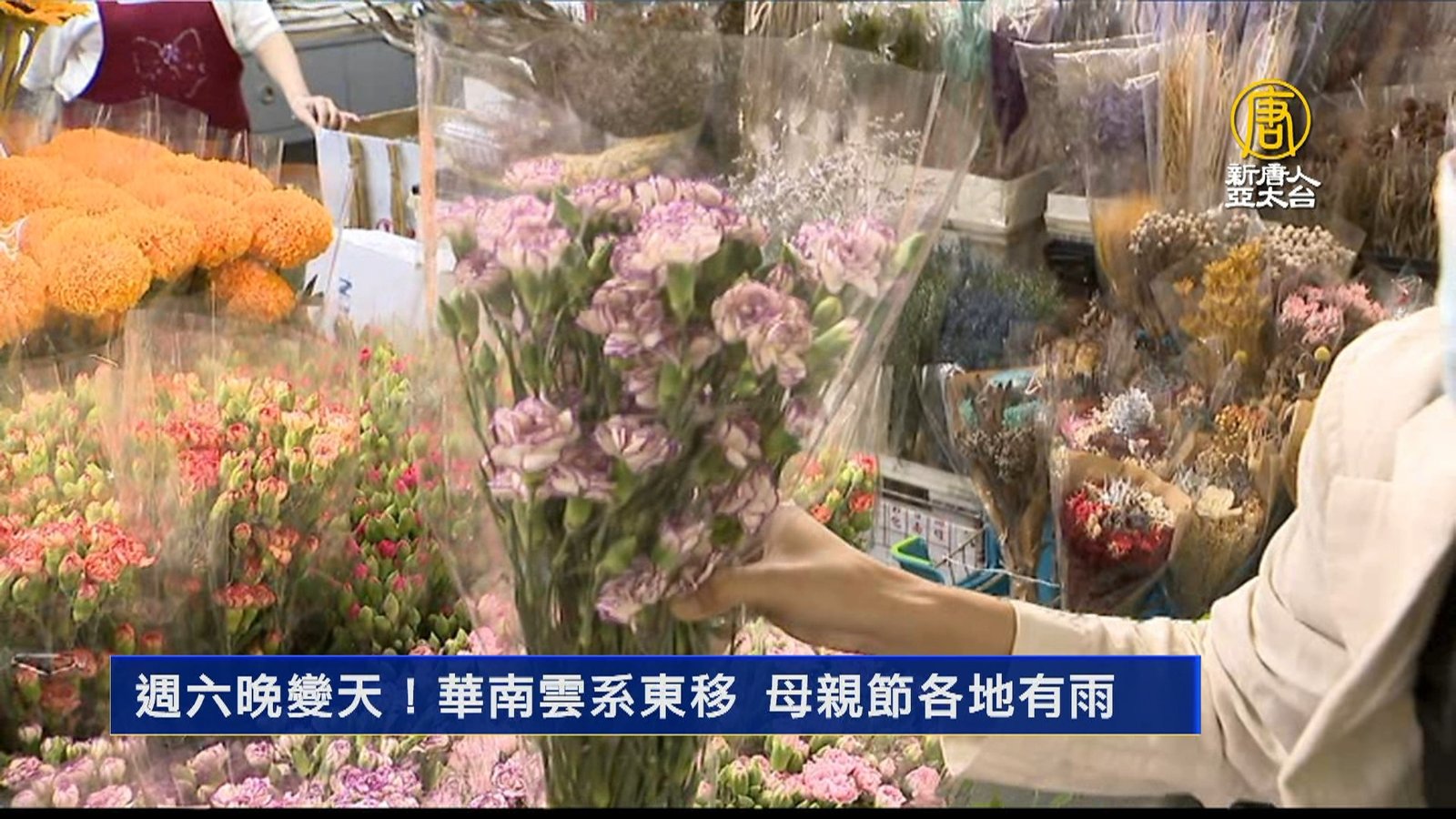 新聞一開始,帶您看到,明天(5月8日)就是母親節了,台北花市一早就出現人潮,不少民眾趁著好天氣要來買康乃馨。不過提醒民眾,今天晚上開始,就要變天了,受到華南雲系東移影響,各地都有短暫陣雨,而且將持續到週一(9日),提醒民眾出門記得要帶把傘。 //asset2.ntdtv.com.tw/public/uploads/assets/2022/05/07/2022-05-07-6276636c2836c.mp4 母親節|康乃馨|台北花市|氣象局|鋒面|天氣預報|202205072022-05-07 21:13:00