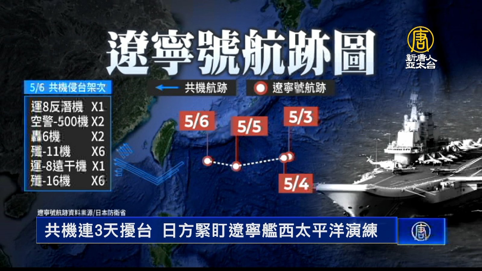 繼5月2號,中共航母遼寧號艦隊穿越宮古海峽之後,日本防衛省連續四天公布遼寧號在西太平洋演訓動態。根據日本防衛省資料,艦隊抵達西太平洋之後,逐漸向西航行,往台灣方向移動,直到5月6日最靠近台灣。而就在同一天,共軍也在台灣西南空域,動員18架軍機擾台,其中轟六、運八更繞台灣南端到東部空域。日本派出雲號全程警戒遼寧號動態,記錄到殲-15戰機與直-18直昇機,密集起降訓練。另外今天(7日)台灣西南空域,則是又有5架共機闖進防空識別區。 //asset1.ntdtv.com.tw/public/uploads/assets/2022/05/07/2022-05-07-627665d0d99fc.mp4 遼寧號|中共|日本|防衛省|202205072022-05-07 21:35:12