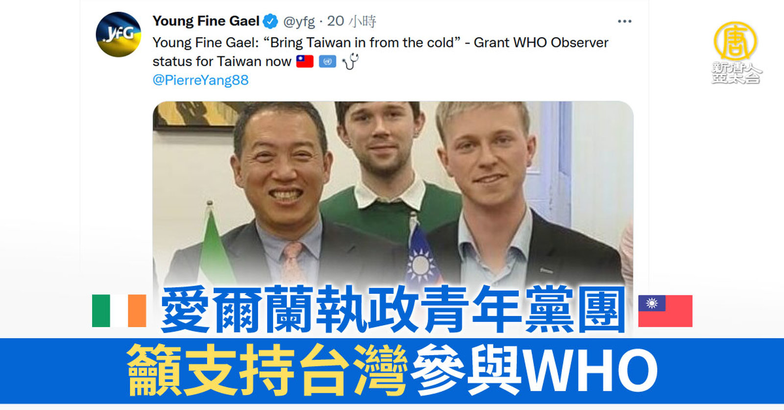 愛爾蘭執政青年黨團 籲支持台灣參與WHO