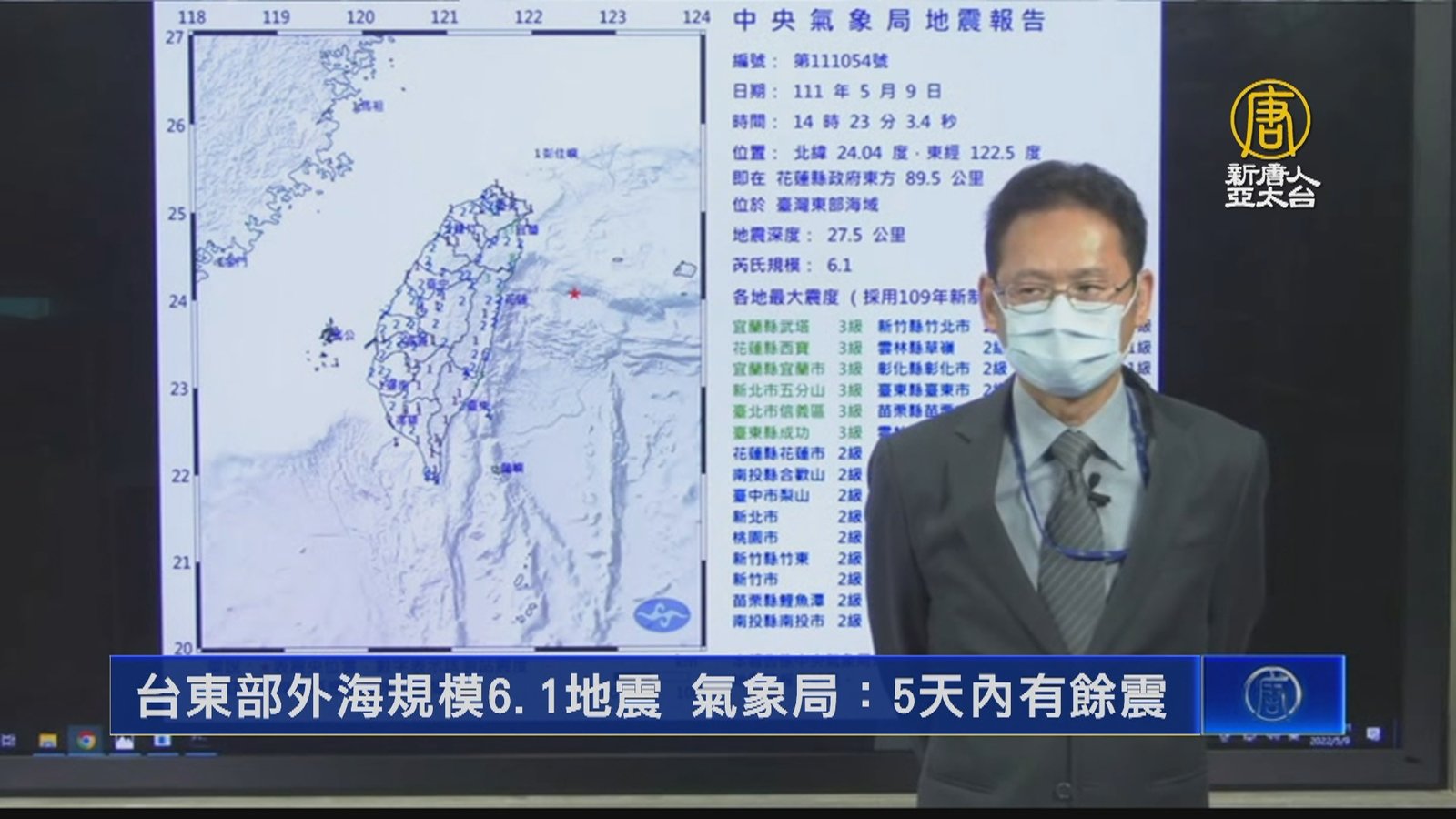 新聞首先來看到,今天(9號)下午兩點23分,台灣東部外海發生規模6.1地震,震源深度27.5公里。各地最大震度包括宜蘭、新北、花東與北市信義區都有三級。地震測報中心表示,這起地震的震央距離台灣較遠,造成災害可能性較低,但不排除五天內,會有規模4到5的餘震。 //asset1.ntdtv.com.tw/public/uploads/assets/2022/05/09/2022-05-09-62790682e3a48.mp4 地震|陳國昌|地震測報中心|氣象局|202205092022-05-09 21:32:44