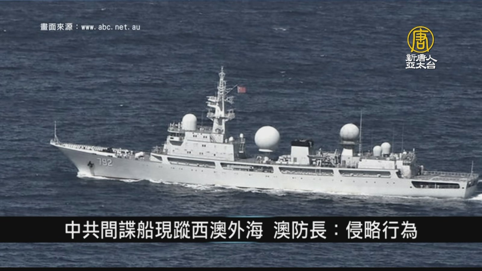 澳洲當局在過去一週,追蹤到一艘中國間諜船出沒在西澳外海,且相當接近位於埃克斯茅斯(Exmouth)的一個海軍通訊基地,澳洲、美國和盟國的潛艇都使用該通訊站。澳大利亞總理莫里森(Scott Morrison)對此表示「擔憂」,國防部長杜登(Peter Dutton)則形容,這是北京的一種「侵略行為」。 //asset1.ntdtv.com.tw/public/uploads/assets/2022/05/13/2022-05-13-627e59da4fdfb.mp4 寰宇掃描|北約|NATO|軍演|俄羅斯|希臘國會|防禦合作協定|中共間諜船|澳洲|溫網|禁賽|俄羅斯球員|納達爾|202205132022-05-13 22:26:23