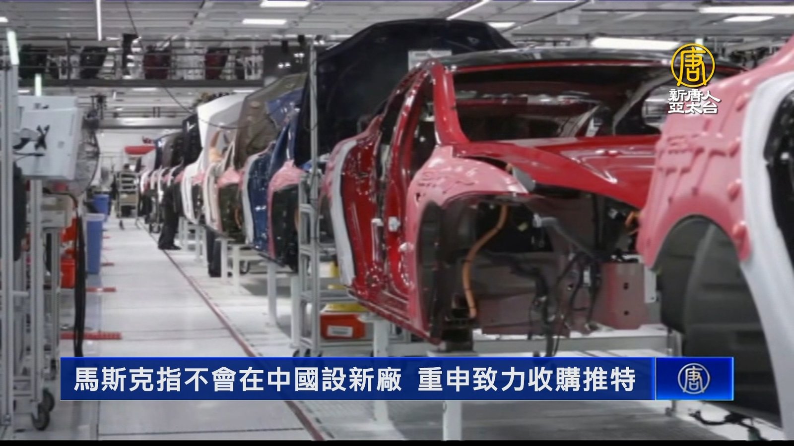 再來看到,特斯拉日前因為上海強制封城,產量損失近五萬輛,而近日流傳,特斯拉計畫在上海建造新工廠,對此,馬斯克在一場視訊論壇上表示,並沒有預計要在中國建造任何新工廠。 //asset3.ntdtv.com.tw/public/uploads/assets/2022/05/14/2022-05-14-627fa09fb8a73.mp4 馬斯克|特斯拉|推特|上海|中國市場|202205142022-05-14 21:17:20