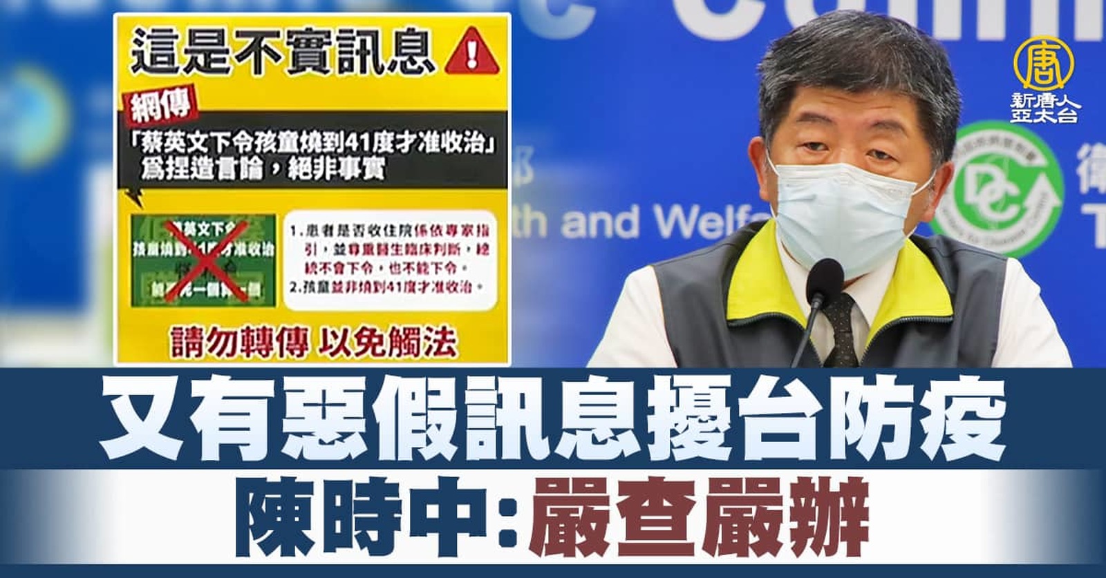 來看到,台灣這段時間以來,相當積極努力在防疫。不過,日前才剛出現多個臉書專頁同時發布「孩子走了」的訊息,擾動民眾防疫信心。現在是又出現了更加惡意的謠言,聲稱兒童發燒到41度醫院才能收治。對此防疫指揮官陳時中嚴正駁斥,並表示,要嚴查嚴辦。 //asset3.ntdtv.com.tw/public/uploads/assets/2022/05/31/2022-05-31-6296095e31989.mp4 中共病毒|孩子走了|假訊息|謠言|202205312022-06-01 11:40:13