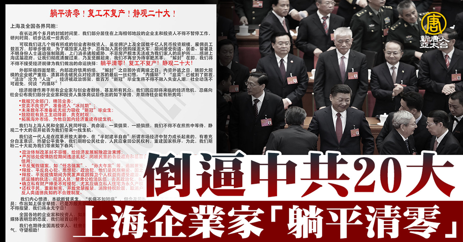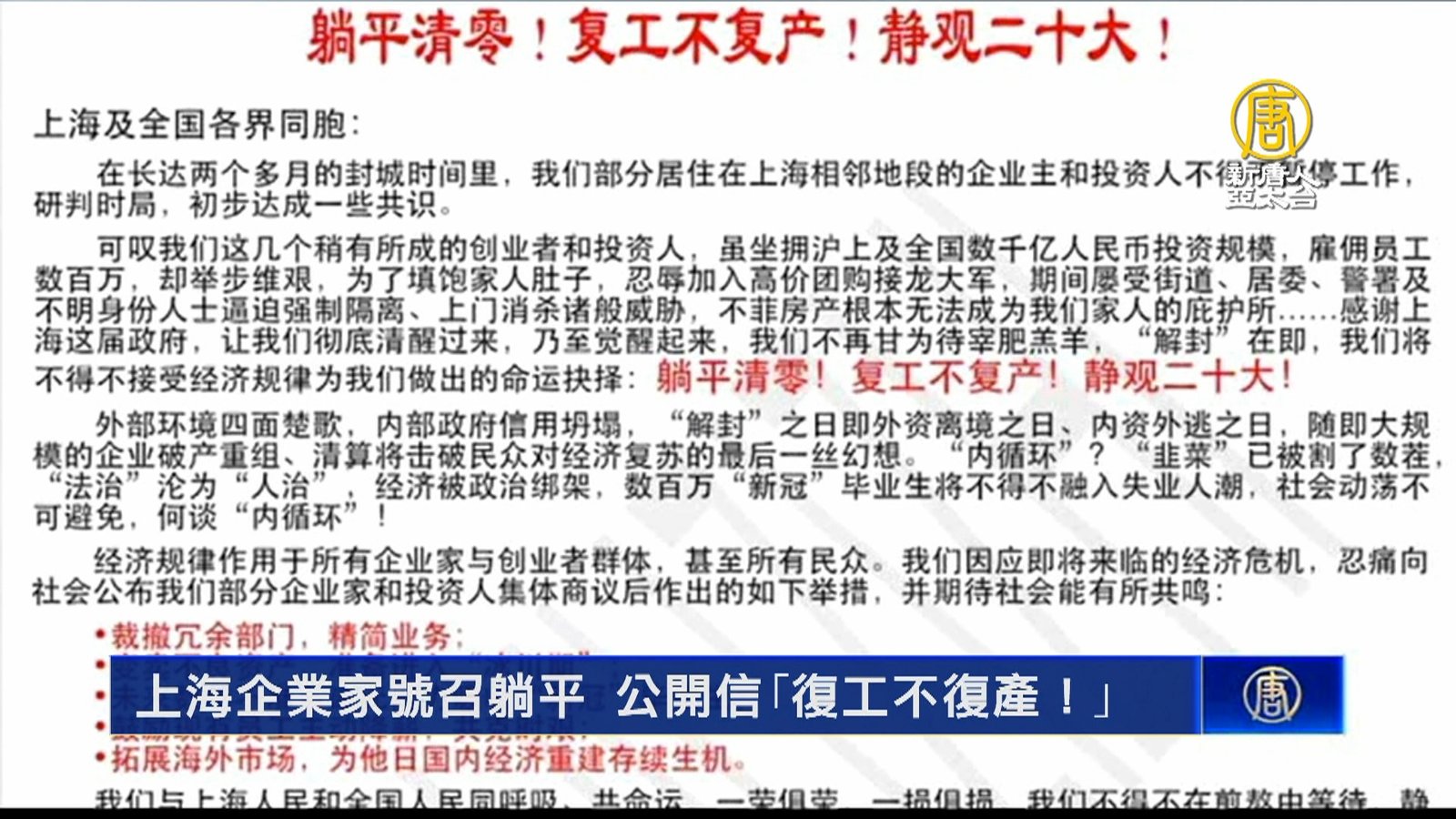 上海雖然宣稱解封,但對於中小企業恐怕還不是太樂觀。網路上熱傳一封上海企業家的公開信,呼籲企業家躺平,復工不復產,來表達對當局的不滿,甚至還要求,嚴懲疫情防控期間罔顧民意的官員,平反冤假錯案,如任志強、孫大午案等,並靜觀二十大,引發網友熱議。 //asset3.ntdtv.com.tw/public/uploads/assets/2022/06/02/2022-06-02-6298ae70e83fd.mp4 上海|企業家|投資|公開信|躺平清零|復工|二十大|改革|202206022022-06-02 21:56:57