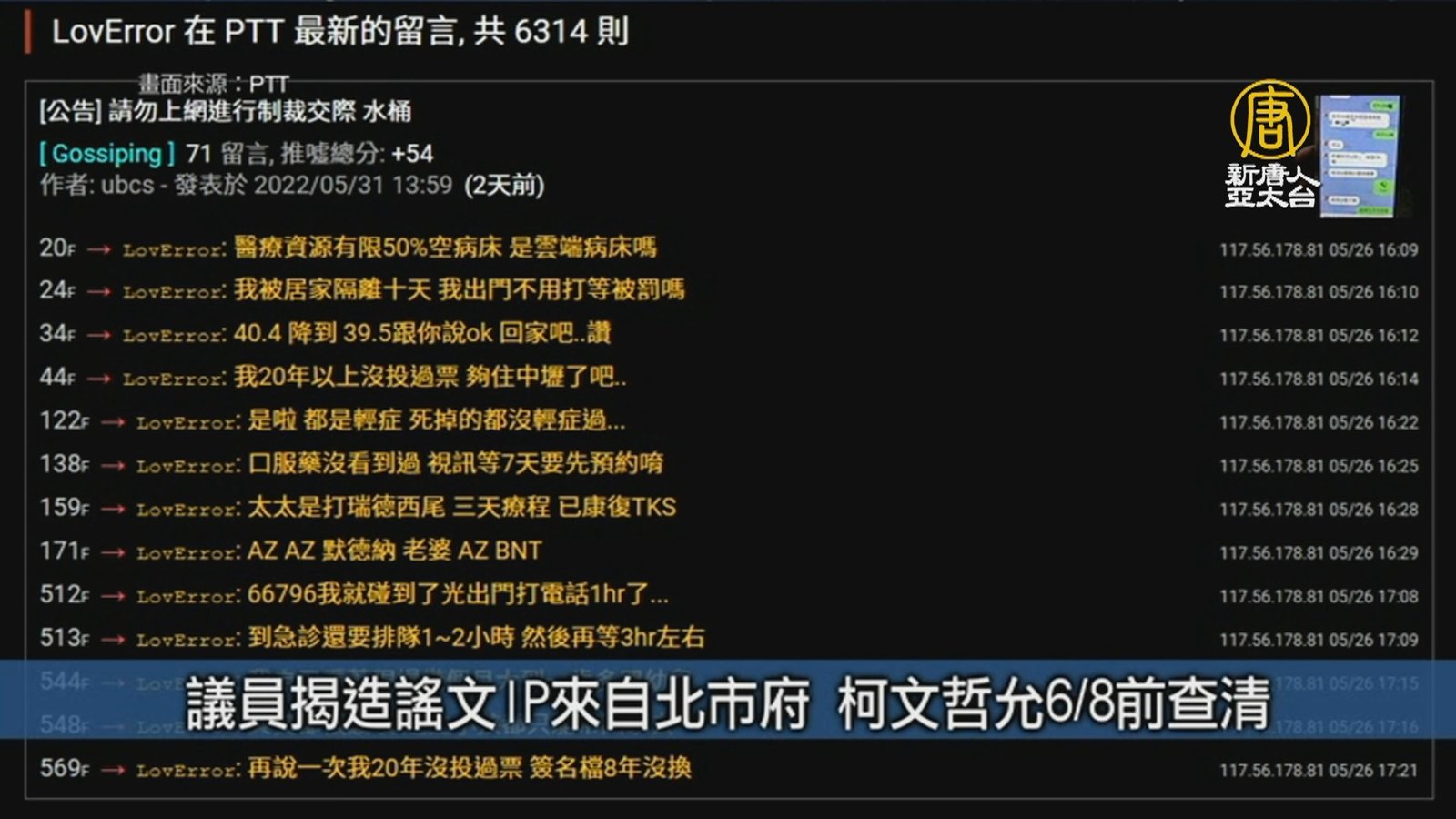 PTT網友「LoveError」日前在網路上發文表示,自己妻子中重症住院,3個孩子高燒40度到台大急診,院方卻說是輕症,隨後卻被抓包造謠,該IP竟來自台北市政府,且在上班時間發文。台北市議員王閔生要求徹查,柯文哲允諾,將在8日前提交報告給議會。 //asset1.ntdtv.com.tw/public/uploads/assets/2022/06/02/2022-06-02-6298b4427f4db.mp4 台灣速速看|造謠文|台北市政府|柯文哲|高端疫苗|南韓|雷達氣象站|港南運河公園|射擊訓練課程|202206022022-06-02 21:59:46