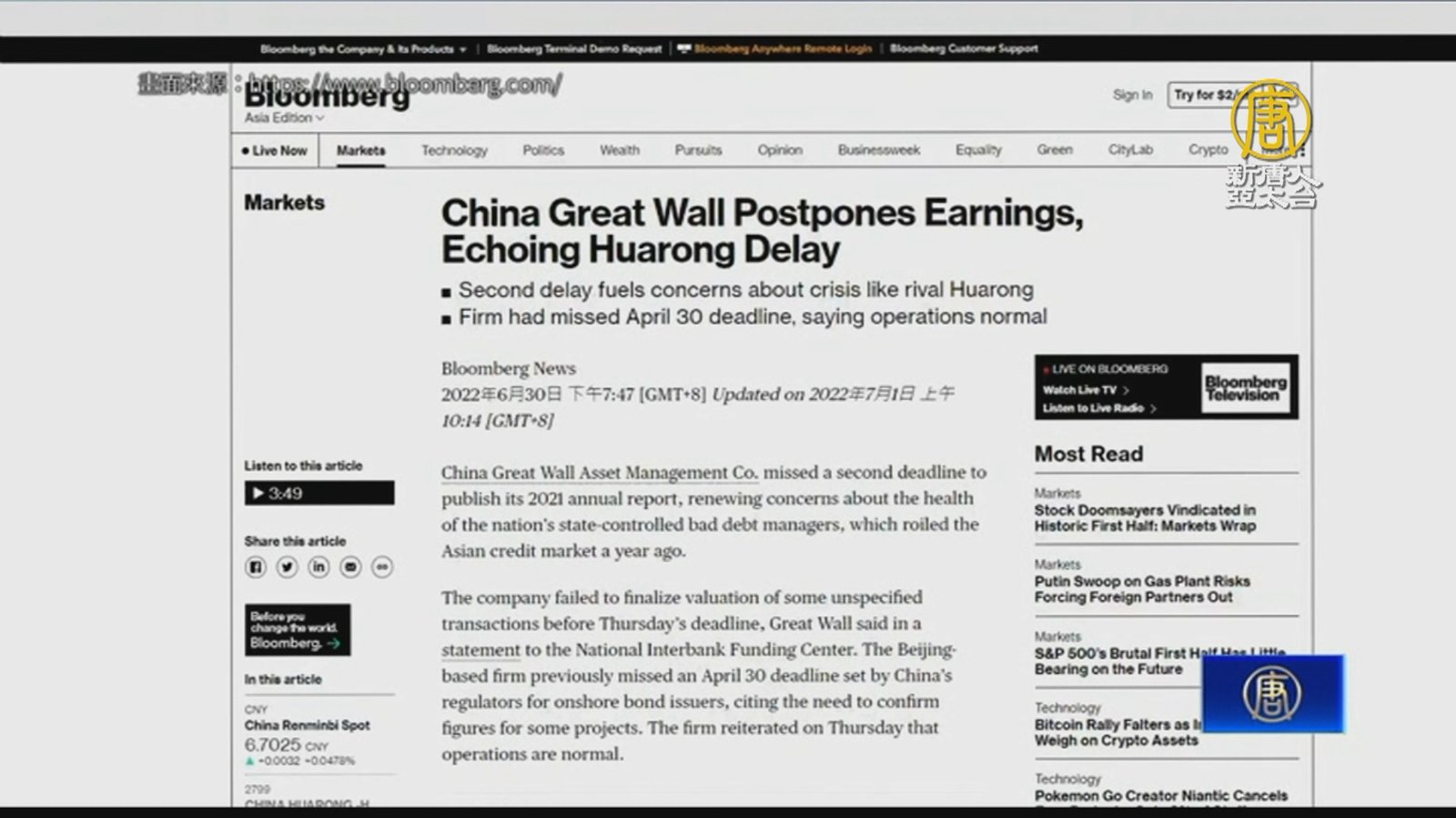 自去年中國華融巨額虧損引發市場動盪以來,中國四大壞帳銀行之一的長城資產,6月30號也發布聲明,表示公司錯過公布2021年度報告最後期限,引發投資者擔憂中國壞帳銀行的財務健康狀況。這是長城資產第二次延期發布年報。根據外媒數據顯示,長城資產2025年到期的2.375%美元債券,利差擴大至5月初以來最大。根據彭博社的數據,長城境外債券共計40億美元,其中包括8月到期的10億美元債券。 //asset1.ntdtv.com.tw/public/uploads/assets/2022/07/01/2022-07-01-62bef4580b1a4.mp4 中國|長城資產|華融|年度報告|美元|債券|票據|壞帳銀行|年報|202207012022-07-01 22:28:36