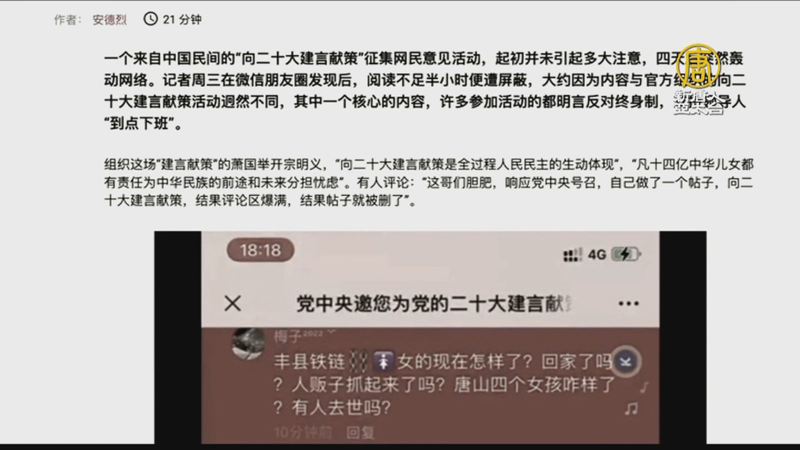 中國一名小粉紅,為響應中共「向二十大建言獻策」的號召,日前發起網上徵集活動,聲稱「向二十大建言獻策,是全過程人民民主的生動體現」,不料,評論區卻出現大量反對中共政府的言論,結果活動被中共封殺。 //asset2.ntdtv.com.tw/public/uploads/assets/2022/07/02/2022-07-02-62c04c31d793f.mp4 小粉紅|向20大建言|翻車|獻策|中共|封殺言論|二十大|202207022022-07-02 22:09:25