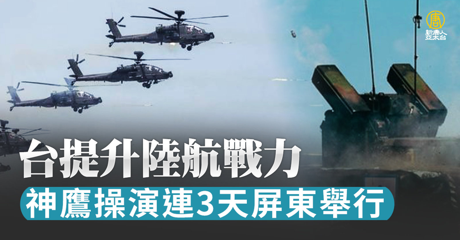 中共升高台海緊張,台灣強化國軍戰力,陸軍航特部年度最大的演習「神鷹操演」,今天(4日)起一連3天在屏東九鵬大沙漠舉行,超級眼鏡蛇、阿帕契、戰搜直升機陸續登場,對海上目標進行精準飛彈射擊,以驗證陸航部隊的戰力。 //asset2.ntdtv.com.tw/public/uploads/assets/2022/07/04/2022-07-04-62c2d871cce2e.mp4 神鷹操演|陸軍航特部|超級眼鏡蛇直升機|阿帕契|戰搜直升機|響尾蛇飛彈|屏東|九鵬大沙漠|202207042022-07-04 22:01:38