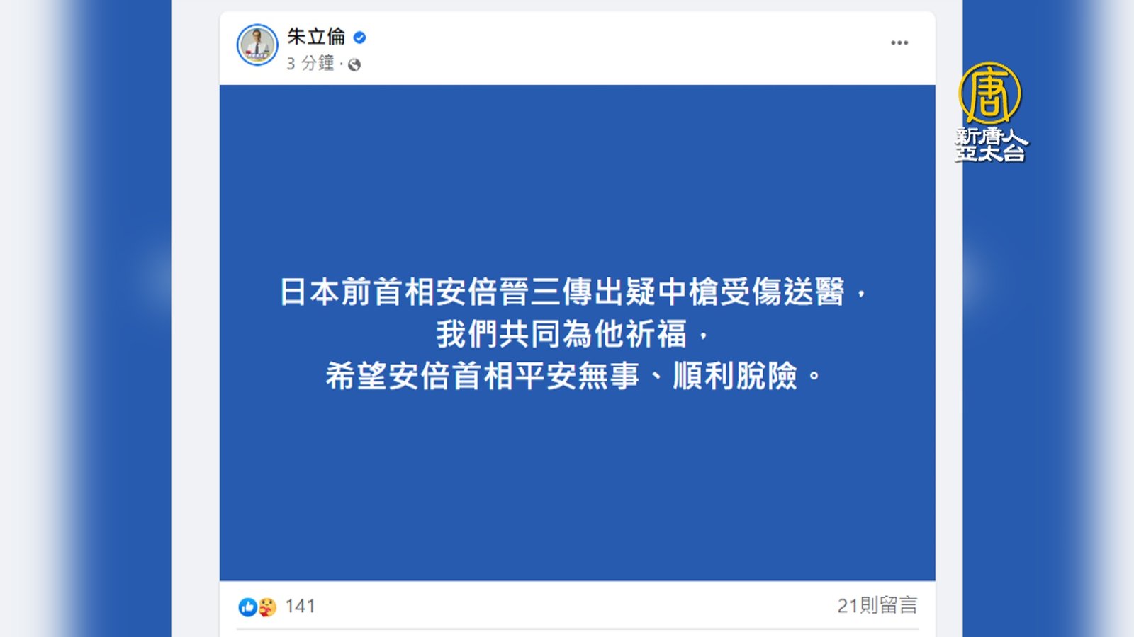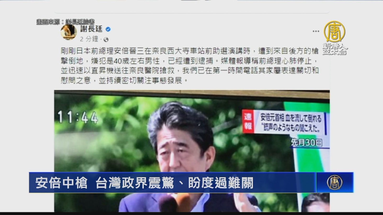 日本前首相安倍晉三遭槍擊送醫不治,總統蔡英文發文表示痛心、遺憾。蔡英文指出,安倍前首相是她認識十多年的老朋友,也是台灣最堅定的友人。從花蓮地震、台灣鳳梨受打壓,還有缺乏疫苗,還有台灣安全議題,安倍都非常關切。許多台灣人,都因為失去堅定支持台灣的有人感到悲傷。希望台日繼續扶持,證明「善的循環」不畏暴力。 //asset3.ntdtv.com.tw/public/uploads/assets/2022/07/08/2022-07-08-62c81fc8befa5.mp4 安倍遇刺|蔡英文|賴清德|台日|202207082022-07-08 22:01:04