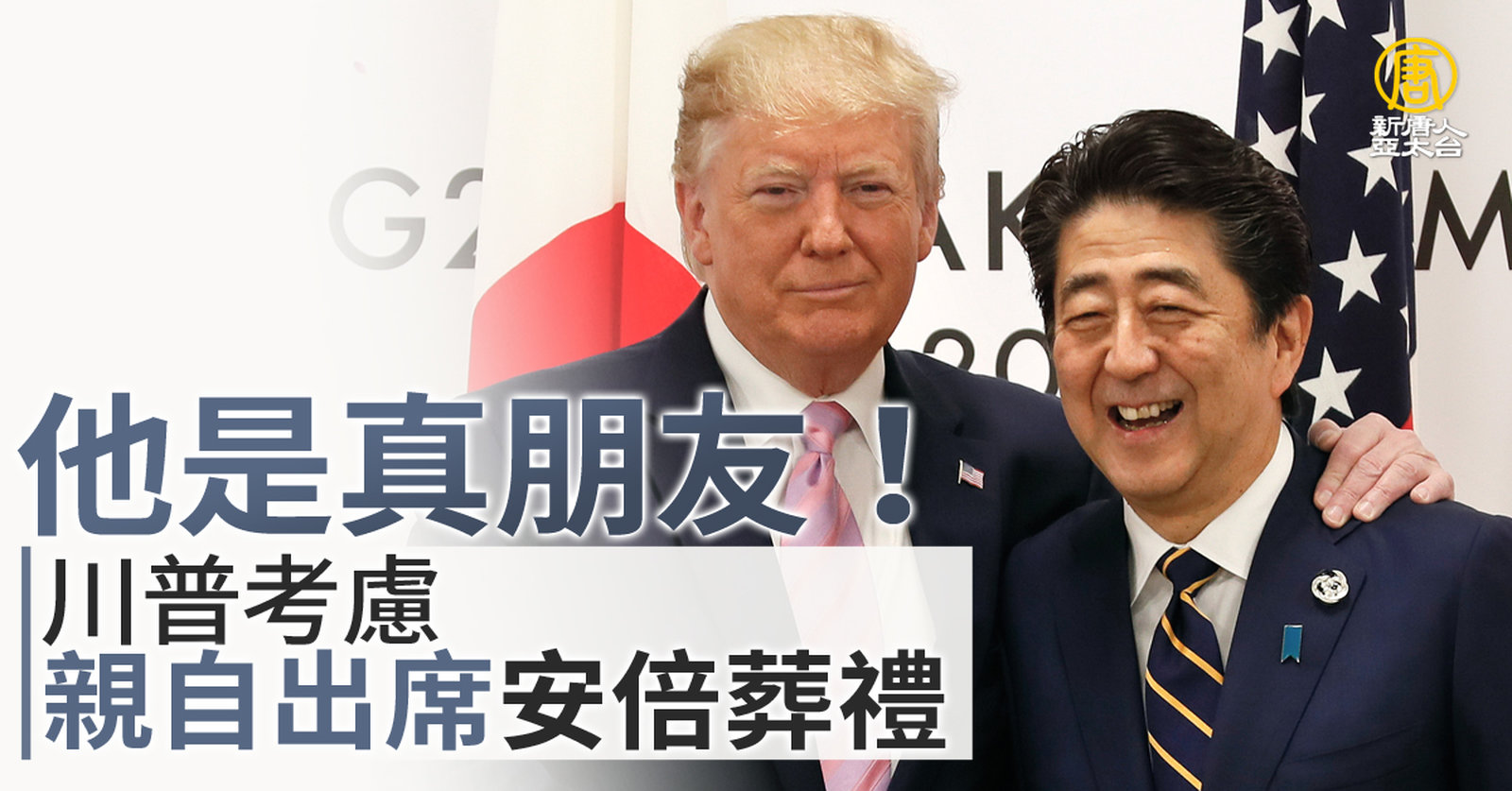 前日本首相安倍晉三的葬禮,明天(7月12日)下午將在東京的增上寺內舉行,美國「布萊巴特新聞網」報導,美國前總統川普透露,他考慮與家人一同出席已故前日本首相安倍晉三的葬禮, 目前正在和安倍的家屬討論中。川普表示,他正在尋求出席安倍葬禮的後勤安排,並且回憶道,安倍晉三在2016年大選後就訪問美國,是川普擔任總統期間會見的第一個世界領導人,2人曾互通電話數十次,並多次互訪,2人也是高爾夫球球友。川普還表示安倍是他真正的朋友。 //asset1.ntdtv.com.tw/public/uploads/assets/2022/07/11/2022-07-11-62cc12c5236f1.mp4 川普|安倍晉三|葬禮|安倍遇刺|202207112022-07-11 20:34:06