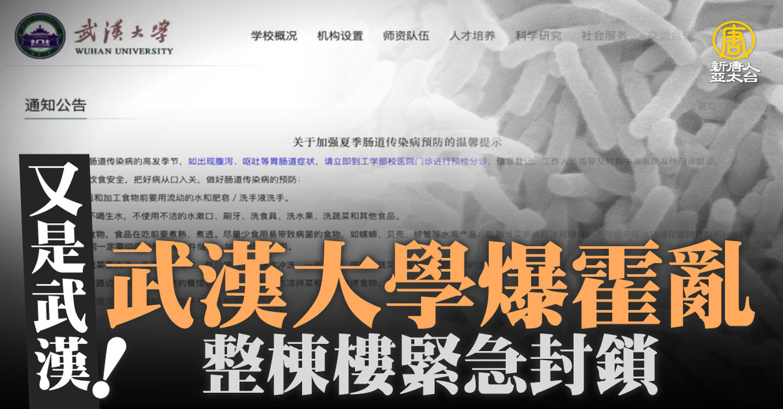 又是武漢!武漢大學爆霍亂 整棟樓緊急封鎖