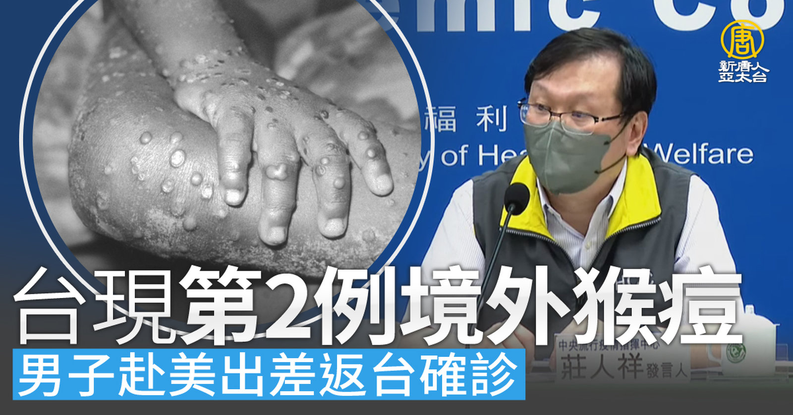 疾管署今天(12日)公布,台灣發現第2例境外猴痘個案,是本國籍從美國返台30歲男子,10號入境台灣,目前在醫院隔離治療中。疾管署副署長莊人祥表示,個案暫時沒有匡列接觸者,也幸好在機場就攔截,沒有社區活動史。 //asset1.ntdtv.com.tw/public/uploads/assets/2022/07/12/2022-07-12-62cd69469fcc8.mp4 猴痘|確診|莊人祥|指揮中心|202207122022-07-12 22:15:18