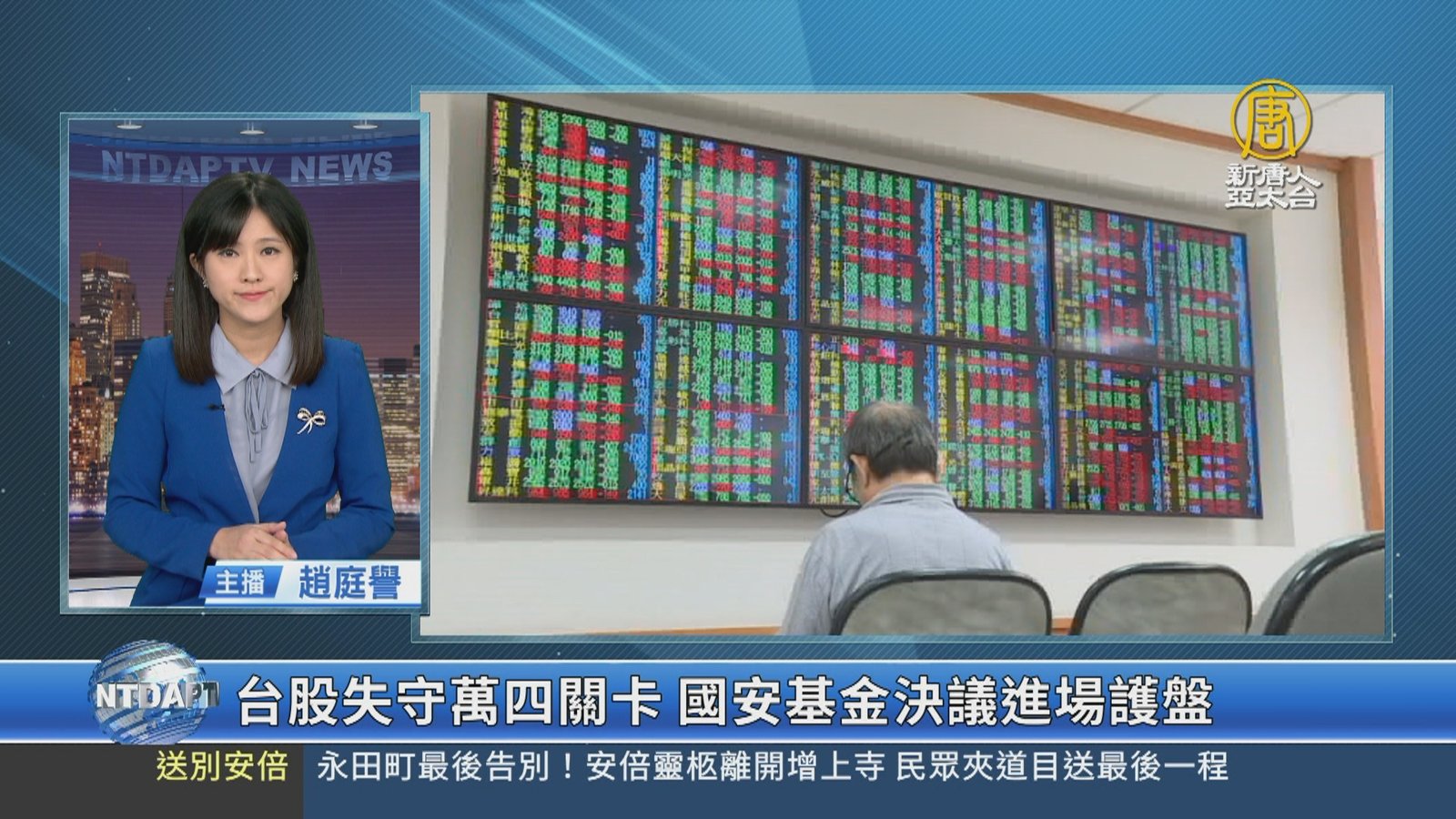 台股今天(12日)盤中大幅下跌,失守萬四關卡,終場以1萬3千9百50點作收,跌幅2.72%。國安基金召開臨時會議後指出,近日成交量萎縮,外資持續賣超,投資信心明顯不足,考量國際政經情勢不確定因素仍多,決議授權國安基金執行秘書阮清華,視情況動用資金執行市場安定任務。 //asset3.ntdtv.com.tw/public/uploads/assets/2022/07/12/2022-07-12-62cd693eddeb3.mp4 台股|萬四關卡|國安基金|護盤|202207122022-07-12 22:14:56
