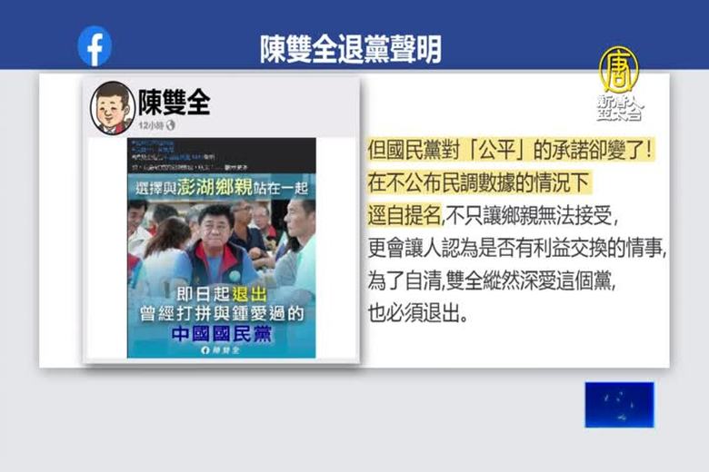 國民黨中常會,今天通過提名澎湖縣長賴峰偉競選連任,但今天凌晨,也有意爭取提名的澎湖縣議會副議長陳雙全,在臉書上發文說,國民黨在不公布民調數據的情況下逕自提名,不只讓鄉親無法接受,更會讓人認為是否有利益交換的情事,因此他決定退出國民黨。這也成為賴峰偉連任之路第一起面對的難題。 //asset2.ntdtv.com.tw/public/uploads/assets/2022/07/13/2022-07-13-62cec33452513.mp4 陳雙全|退黨|澎湖縣長|澎湖縣議會|國民黨|九合一選舉|2022九合一|202207132022-07-13 22:33:22