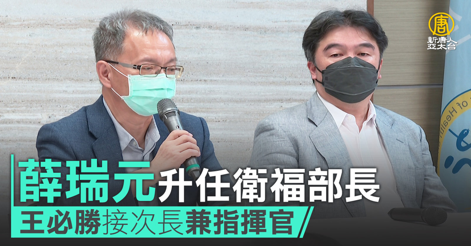 再來看到,台灣衛福部長陳時中請辭獲准,行政院今天(15日)公布新人事,次長薛瑞元升任部長,王必勝升任次長並兼任中央防疫指揮官,特聘張上淳出任行政院首席防疫顧問;三人會共同出席行政院各項重要防疫會議。 //asset2.ntdtv.com.tw/public/uploads/assets/2022/07/15/2022-07-15-62d15c0dcf816.mp4 衛福部|指揮中心|薛瑞元|王必勝|行政院|202207152022-07-15 22:09:36