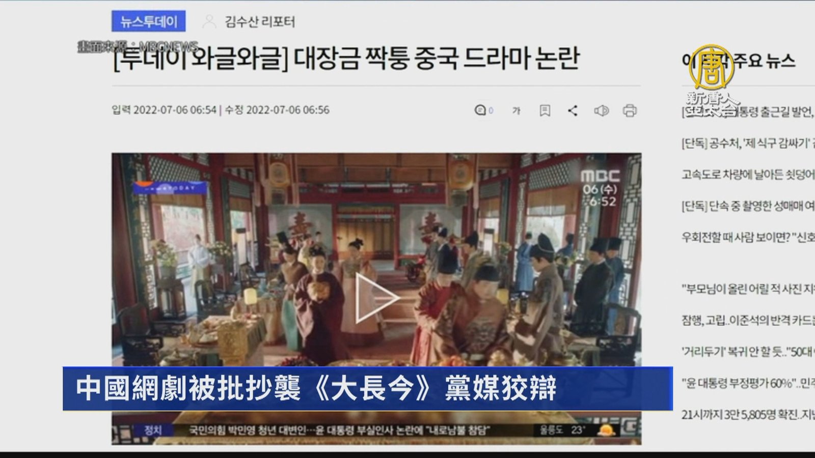 日前,中國網劇《珍饈記》被韓國媒體批評涉嫌山寨韓劇《大長今》,而且抄襲韓服、韓食。中共黨媒刊文辯解,並攻擊韓國網民,引發論戰。 //asset2.ntdtv.com.tw/public/uploads/assets/2022/07/16/2022-07-16-62d2b7d1474b3.mp4 中國網劇|珍饈記|山寨|大長今|抄襲|文睿|202207162022-07-16 21:11:30