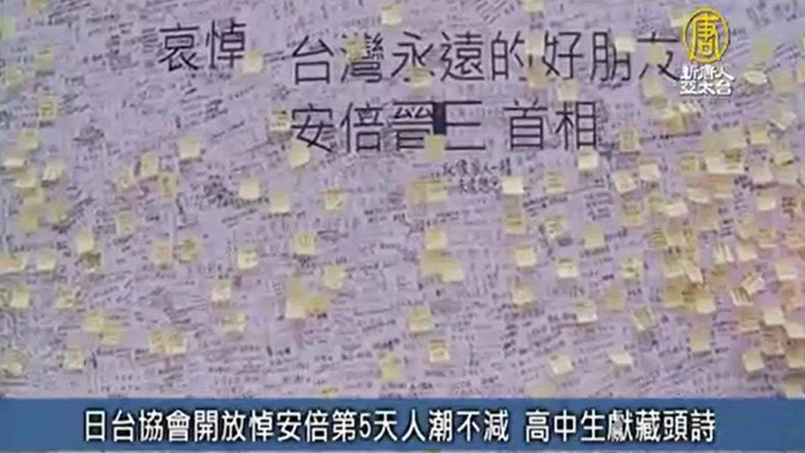 日本前首相安倍晉三遭刺殺,許多人前往日本台灣交流協會弔唁,日台交流協會特別開放地下一樓外牆作為留言區,並公布了一張照片高中生以書法字寫下藏頭詩,頭尾讀來正好是「安倍晉三、日台永懷」,文采引起許多網友讚嘆。 //asset3.ntdtv.com.tw/public/uploads/assets/2022/07/16/2022-07-16-62d2b5ba49b06.mp4 BA.5|工安|大理石|花蓮港|意外|射箭|行李|八歌浪|葛萊美獎|日台交流協會|安倍遇刺|202207162022-07-16 21:05:21
