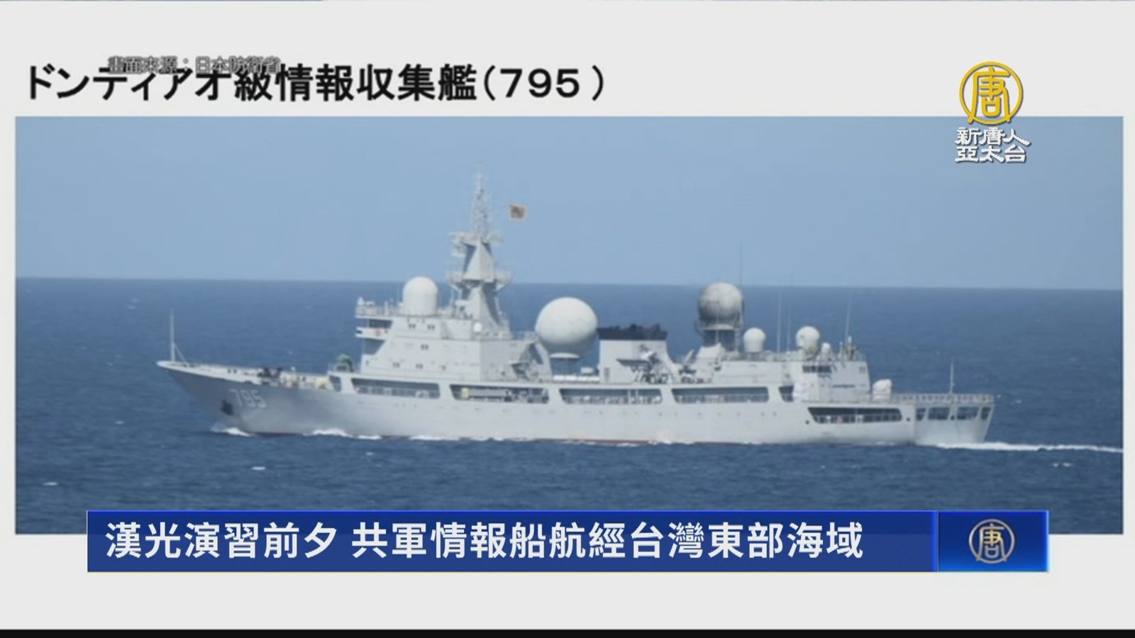 國軍漢光演習前夕,共軍軍艦出沒台灣東部海域,日本防衛省公布一艘中共情報船,21日凌晨在沖繩釣魚島西北160公里處的海域,南下航經台灣東部海域進入太平洋。日本海上自衛隊出動P-3C反潛機、「夕立號」護衛艦等,對共艦進行警戒監視。據報導,中共情報船的任務是在蒐集水文資料,取得海洋戰場經營優勢。由於下週漢光演習,蔡總統將登艦出海視導,共軍船隻此時出沒東部海域,時機點格外敏感。 //asset2.ntdtv.com.tw/public/uploads/assets/2022/07/22/2022-07-22-62daa261a297f.mp4 中共|共軍|擾台|共艦|日本|海上自衛隊|漢光演習|202207222022-07-22 21:54:37