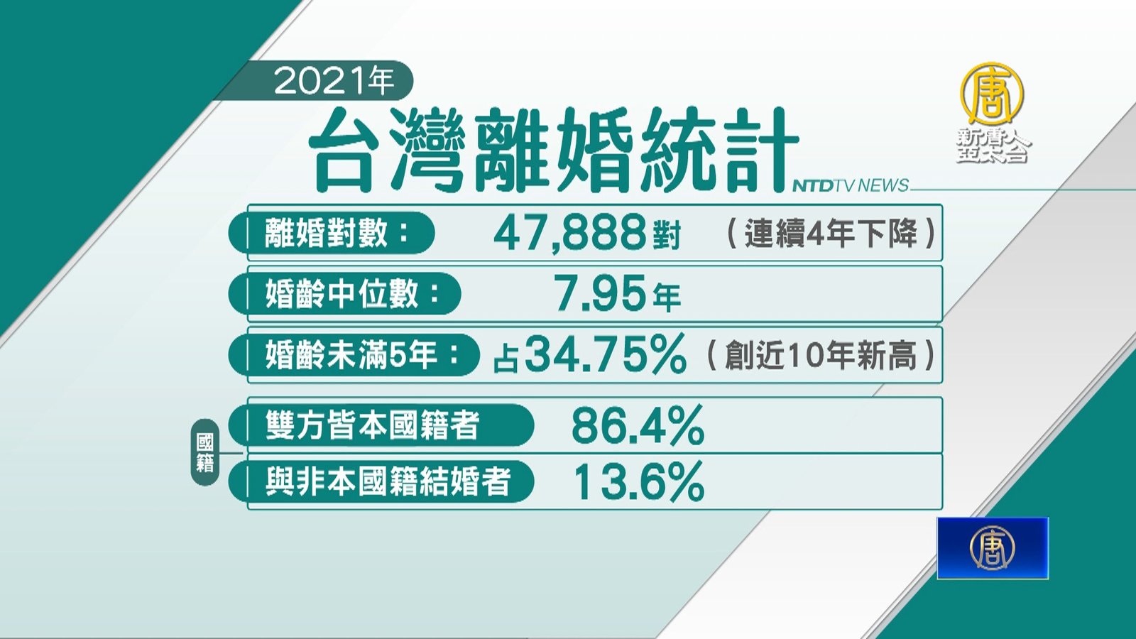 根據內政部最新統計。去年台灣離婚對數共4萬7千8百88對,平均每天有1百31.20對離婚,已連續4年下降。婚齡中位數為7.95年,也就是半數離婚者的婚齡,都沒有超過8年。其中,婚齡未滿5年的人數最多,有34.75%,創下近10年新高。如果以國籍來看,雙方皆本國籍者佔86.4%,與非本國籍結婚者佔13.6%。 //asset2.ntdtv.com.tw/public/uploads/assets/2022/07/23/2022-07-23-62dbeed3dfc0a.mp4 離婚率|結婚率|單身|內政部|202207232022-07-23 21:12:08