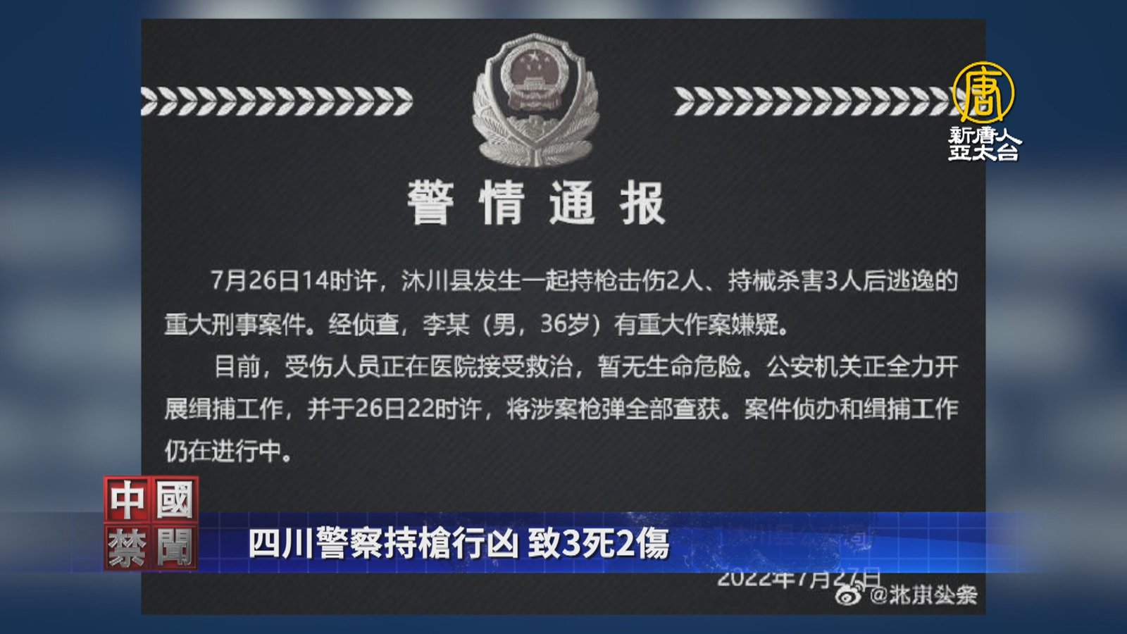 四川樂山沐川縣警察李強持槍殺人逃逸後,27號,當地警方發布的警情通報和10萬元懸賞通告,並出動數千警察、民兵進山展開大搜捕,但卻隻字未提李強的警察身份,也沒有提及作案原因。網絡上有知情者披露內情,指受傷女與李強「戀愛」多年,3名死者是女方的子女及公公。目前李強攜帶的槍彈已全部查獲,但他本人仍下落不明。 //asset1.ntdtv.com.tw/public/uploads/assets/2022/07/28/2022-07-28-62e28c16b3bc1.mp4 四川警察|持槍行凶|李強|樂山沐川縣|202207282022-07-28 22:22:39