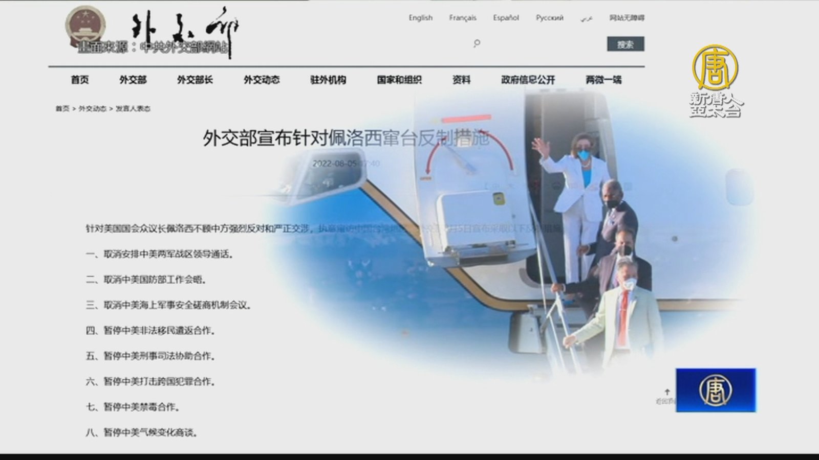 對於美國眾議院議長裴洛西訪問台灣,中共外交部官網在今天(5日)下午接連發布2份制裁措施。先是以發言人名義宣布,根據中共有關法律,對裴洛西及其直系親屬採取制裁措施。另一份則是中共外交部宣布,停止與美國在多個領域的合作,包括高級軍事指揮官之間的對話,國防部工作會晤、海上軍事安全磋商機制會議、打擊跨國犯罪合作,氣候變化商談等8項具體措施。藉此報復裴洛西本週訪問台灣。 //asset3.ntdtv.com.tw/public/uploads/assets/2022/08/05/2022-08-05-62ed0afe1218e.mp4 裴洛西訪台|中共|報復|中共外交部|美國|202208052022-08-05 23:29:03