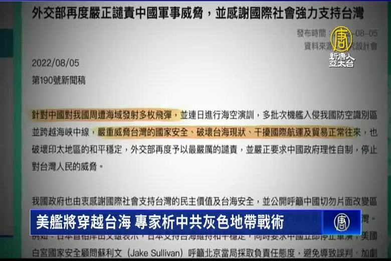 中共對台灣文攻武嚇,白宮表示,美國軍艦將穿越台海,捍衛自由印太地區。專家分析,中共除了透過軍演表達不滿之外,還會繼續使用各種「灰色地帶戰術」進行種種脅迫恫嚇舉動,專家認為,中共是想利用所謂軍演的形式對台灣社會構成威脅,而不是真正想造成實質的衝突。 //asset2.ntdtv.com.tw/public/uploads/assets/2022/08/06/2022-08-06-62ee5ff9b239b.mp4 中共|台灣|文攻武嚇|裴洛西訪台|中共軍演|雷根號|航空母艦|202208062022-08-06 21:26:45