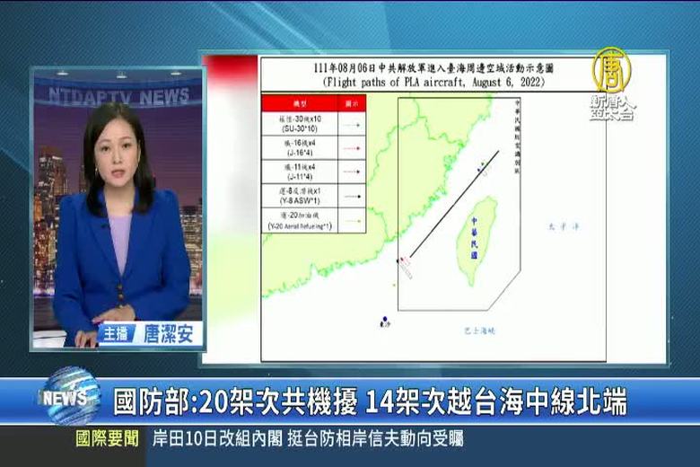 中華民國國防部今晚發布資訊指出,截至今天下午5點止,有20架次共機、14艘次共艦,在台海周邊演習。其中,有14架次共機,包括10架蘇愷30、4架殲11,逾越台灣海峽中線北端,國軍透過空中兵力、艦艇及岸置飛彈應處。 //asset1.ntdtv.com.tw/public/uploads/assets/2022/08/06/2022-08-06-62ee646117f9c.mp4 中共軍演|東風飛彈|共機擾台|台海中線|共艦|202208062022-08-06 21:36:33