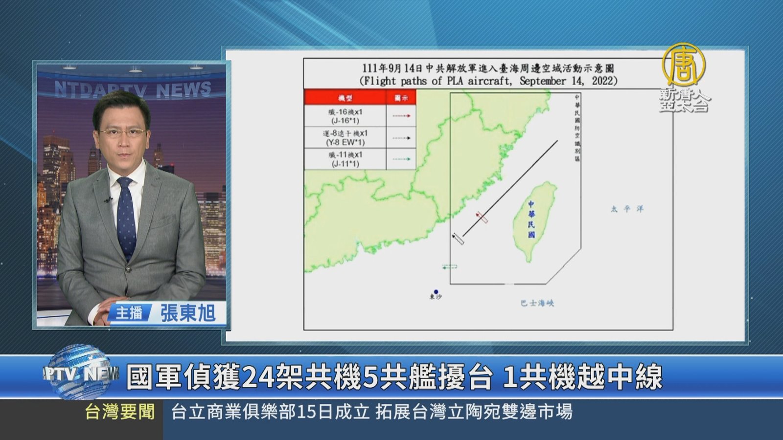 中共8月圍台軍演後,頻頻軍演、企圖常態化派軍機軍艦越過海峽中線侵擾。中華民國國防部(14日)表示,今天(14日)偵獲中共軍機24架次、中共軍艦5艘,持續於台灣周邊海空域活動,其中1架次共機逾越海峽中線、2架次進入西南防空識別區。台灣軍方運用任務軍機、軍艦及岸置飛彈系統嚴密監控與應處。 //asset2.ntdtv.com.tw/public/uploads/assets/2022/09/14/2022-09-14-6321c56790c61.mp4 共機擾台|台海中線|202209142022-09-14 21:23:57