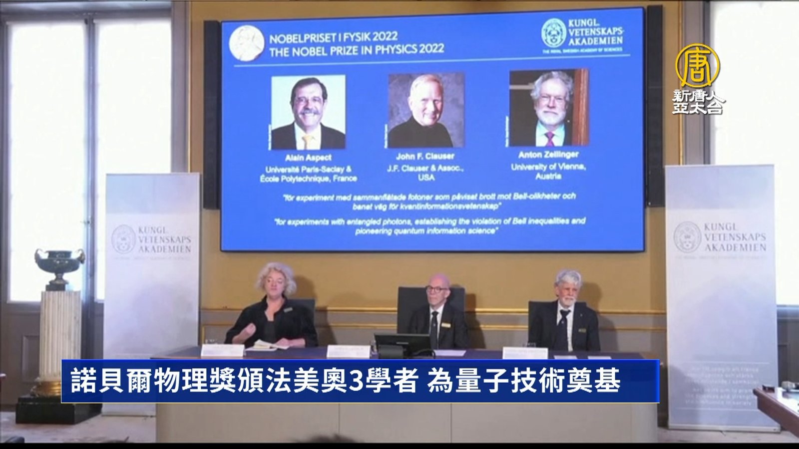 帶您看到,2022諾貝爾物理學獎,在台灣時間傍晚(4日)揭曉,由法國物理學家阿斯佩以及美國籍與奧地利量子物理學家,克勞澤和塞林格三人共同獲獎,表彰他們在糾纏光子的實驗、貝爾不等式及量子資訊科學等方面的突破性貢獻。繼生醫獎、物理獎之後,明天(5日)也將一一公布諾貝爾化學獎、文學等獎項。 //asset2.ntdtv.com.tw/public/uploads/assets/2022/10/04/2022-10-04-633c2615832b4.mp4 諾貝爾物理學獎|量子|阿斯佩|克勞澤|塞林格|202210042022-10-04 22:01:07