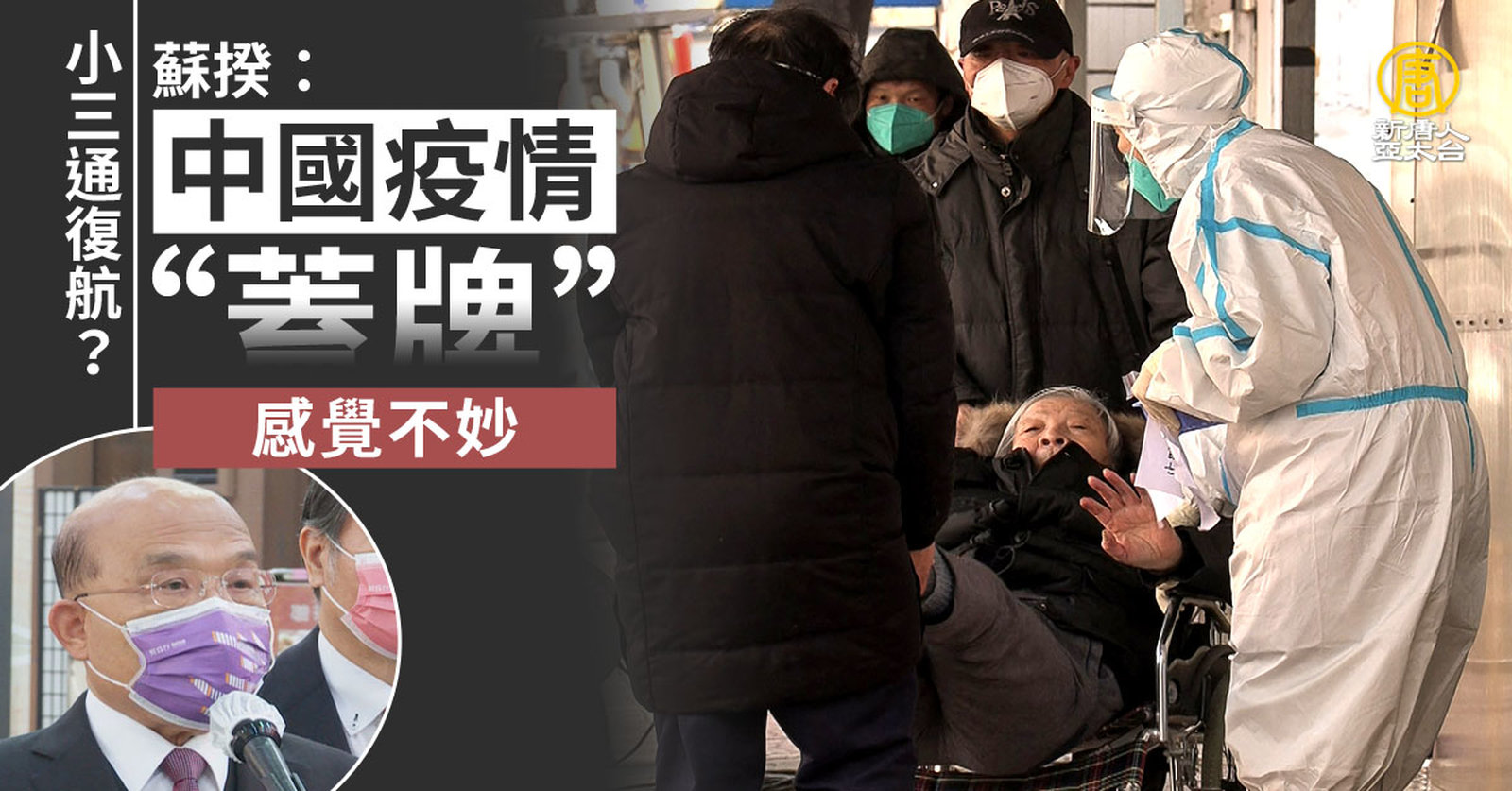 新聞首先帶您關心,黃曆過年即將到來,是否重啟小三通,行政院長蘇貞昌今天(14日)表示,中國疫情快速變化,中國人民都在排隊搶藥,令人覺得事情不太妙。他強調,要以保護國人健康為第一考量,從各方面判斷如何執行小三通。 //asset2.ntdtv.com.tw/public/uploads/assets/2022/12/14/2022-12-14-6399bcd96e294.mp4 陳玉珍|小三通|金酒|蘇貞昌|中國疫情|202212142022-12-14 22:05:55