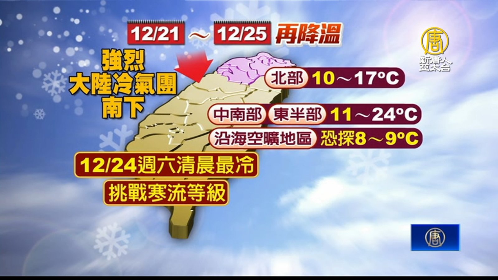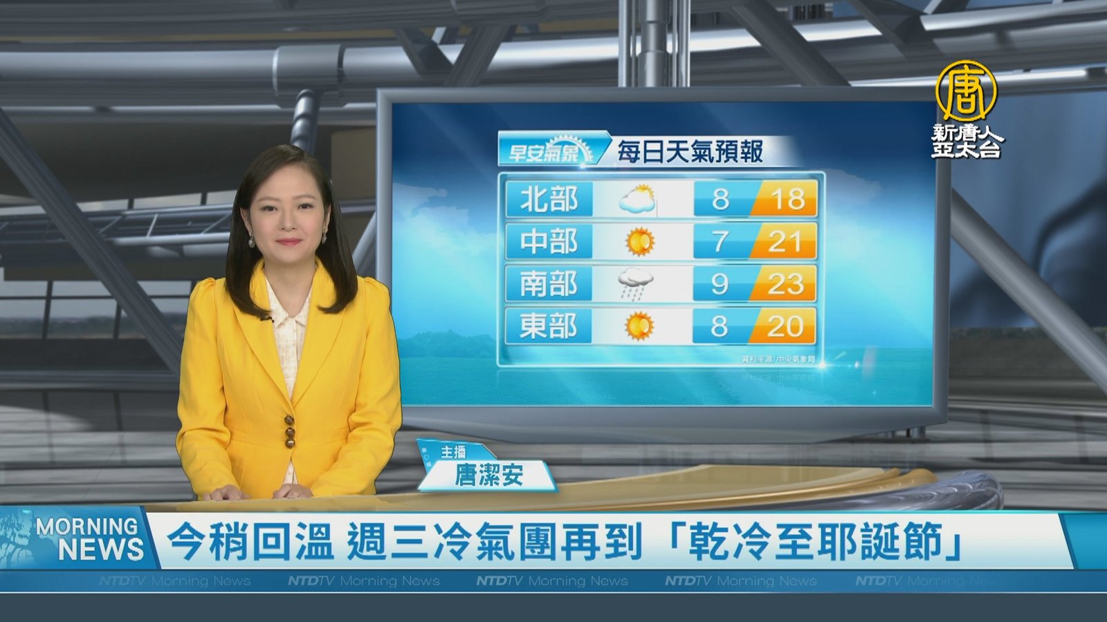 新聞一開始,來關心天氣,寒流離開,今天(19日)白天各地開始回暖放晴了,不過下一波冷空氣很快,在週三(21日)又要來了,且一路冷到聖誕節,甚至不排除又會達到寒流等級,氣象局提醒,今年(2022年)因為是反聖嬰年,所以容易出現較強的東北季風。目前預報顯示,跨年前後還有一波冷空氣襲台,民眾要做好禦寒措施。 //asset1.ntdtv.com.tw/public/uploads/assets/2022/12/19/2022-12-19-63a053d95a7ad.mp4 寒流|天氣|冷空氣|聖誕節|低溫|太平山|霧淞|氣象局|天氣預報|202212192022-12-19 21:54:24