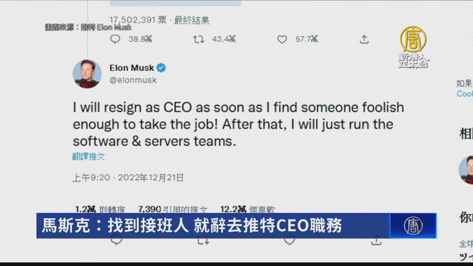 推特老闆馬斯克今天上午在推特發文表示,他一旦找到「夠笨」的人,願意接掌推特執行長,他將辭去CEO一職,在那之後,他只會經營軟體與伺服器團隊。先前馬斯克在推特舉行網路民調,詢問網友自己是否該卸任推特執行長,並強調會遵循民調結果,結果 1750萬用戶參與投票,其中,有過半投票者支持他卸任。 //asset1.ntdtv.com.tw/public/uploads/assets/2022/12/21/2022-12-21-63a3013341a30.mp4 推特|馬斯克|推特執行長|202212212022-12-21 20:52:27