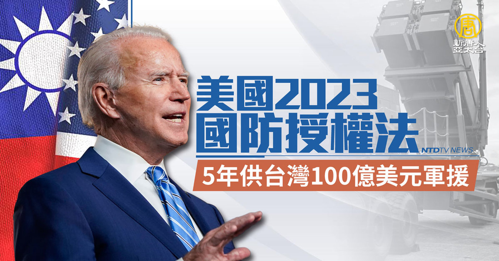 23號,美國總統拜登簽署了《2023年度國防授權法案》,其中納入了部分《台灣政策法案》,授權未來5年,提供台灣100億美元軍援,並且要求加速處理台灣軍購,為台灣送來了聖誕大禮。 //asset2.ntdtv.com.tw/public/uploads/assets/2022/12/24/2022-12-24-63a6ecf15440d.mp4 美台關係|國防授權法|軍售|202212242022-12-24 22:00:38