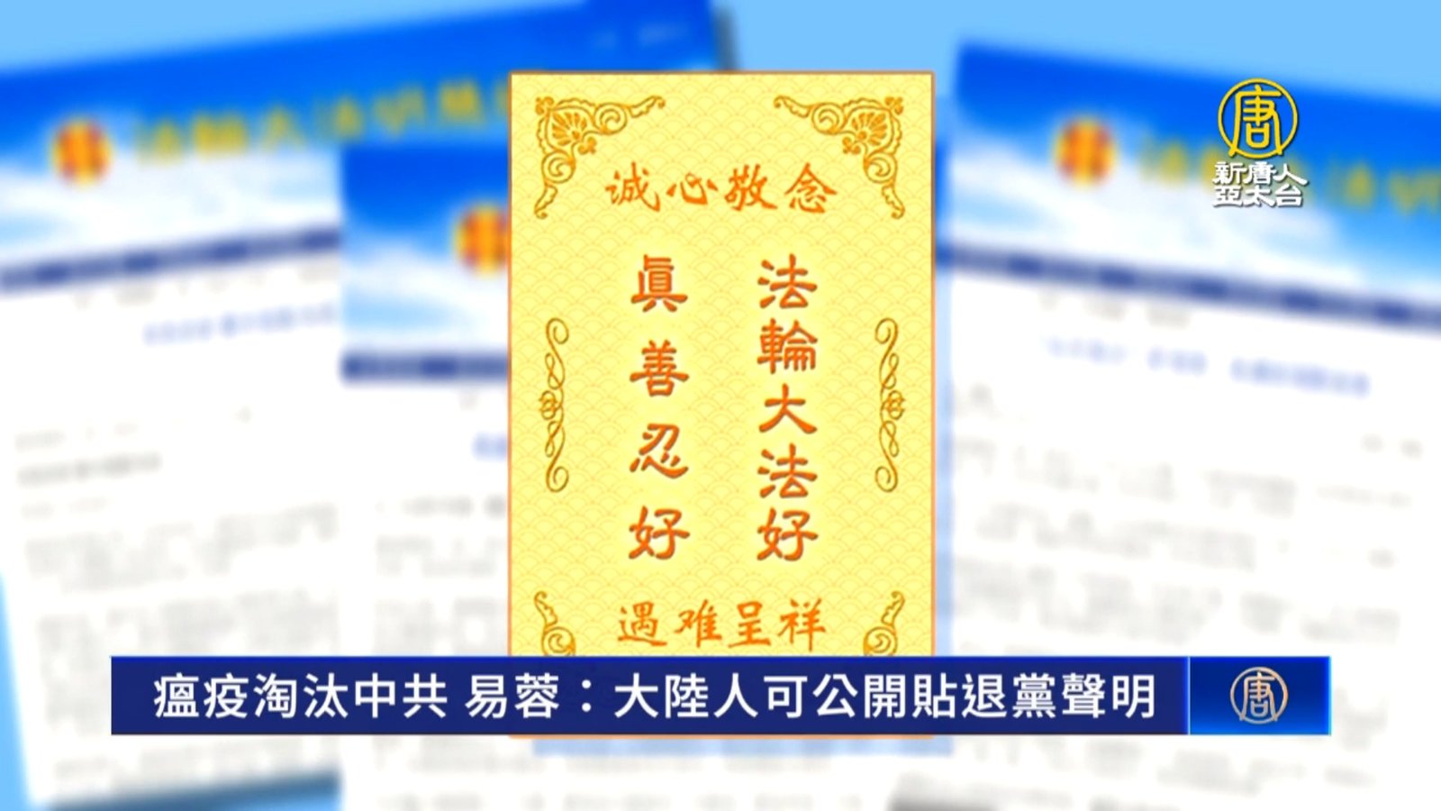 中國大陸疫情凶猛,全球退黨服務中心主席易蓉呼籲,中國人趕快退出中共黨、團、隊組織,把聲明張貼到公共場所或寫在紙幣上同樣有效,同時希望那些跟隨中共作過惡的人要懺悔。 //asset1.ntdtv.com.tw/public/uploads/assets/2022/12/24/2022-12-24-63a6f9ccb0315.mp4 全球退黨服務中心主|三退|懺悔|法輪功創始人|李洪志|中共病毒|202212242022-12-24 22:33:15