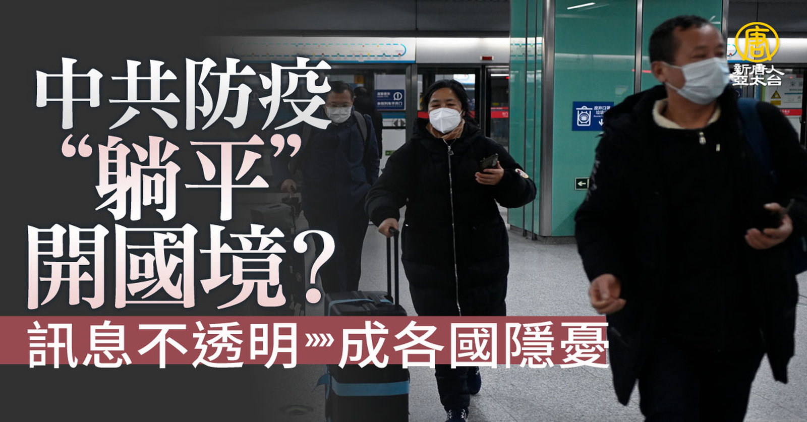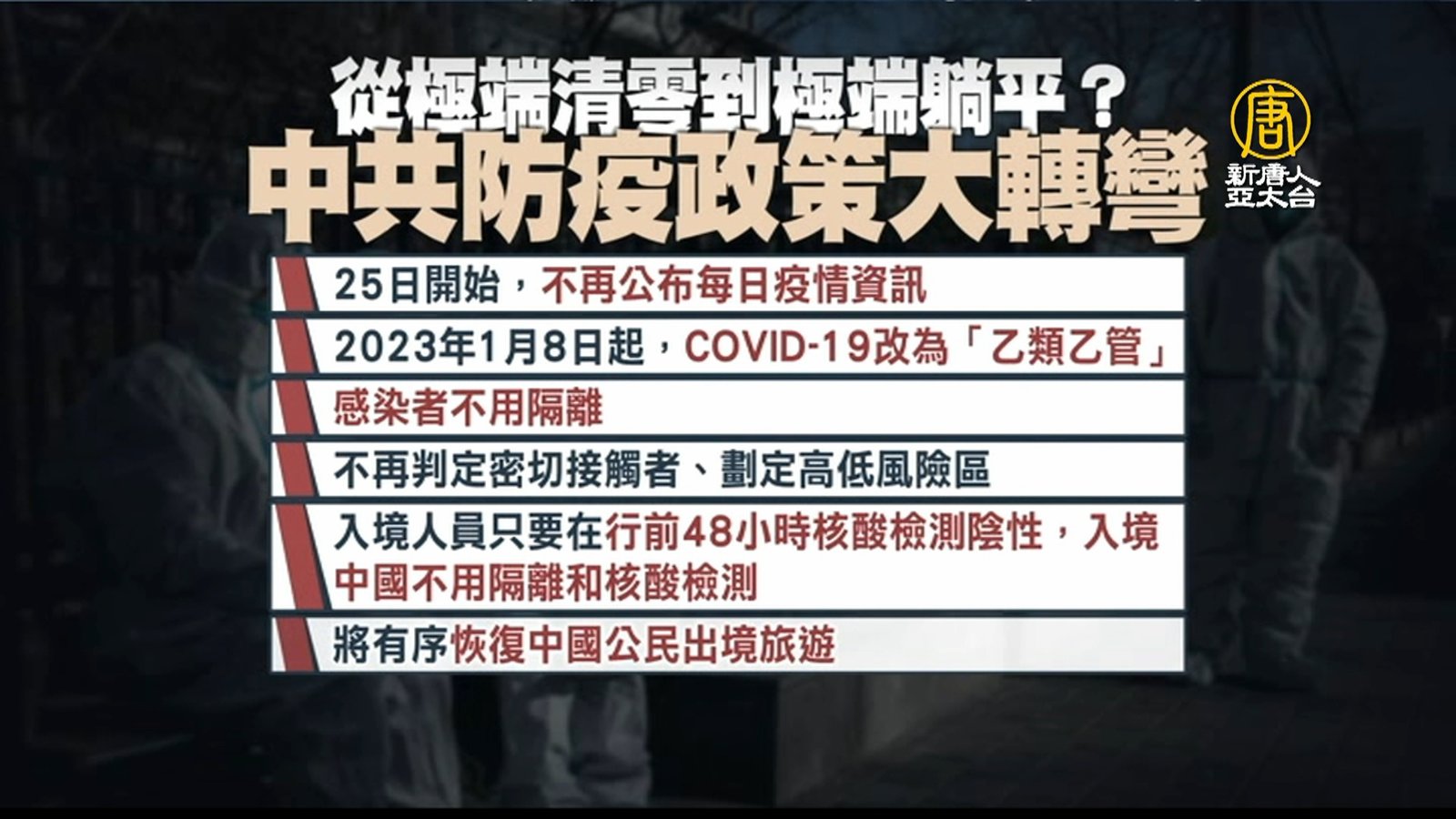中國疫情升溫,各地醫院、殯儀館不堪負荷,藥品嚴重短缺。中共官方每天通報的疫情數據失真,甚至新增死亡病例掛零,受外界批評。就在這個時候,中共衛健委除了宣布不再發布每日疫情訊息之外,昨天(26日)晚上又宣布,明年1月8日開始,將COVID-19從「乙類甲管」調整為「乙類乙管」,包括感染者不用隔離、不再判定密切接觸者以及不再劃定高低風險區等。而且將放寬出入境管制,入境大陸只要在行前48小時核酸檢測為陰性,就不用隔離與核酸檢測,並稱將有序恢復中國公民出境旅遊,引發外界擔憂,影響面擴及國際社會。 //asset2.ntdtv.com.tw/public/uploads/assets/2022/12/27/2022-12-27-63aae22c82cbc.mp4 中國疫情|中共病毒|中共|乙類乙管|隔離|202212272022-12-27 22:45:44