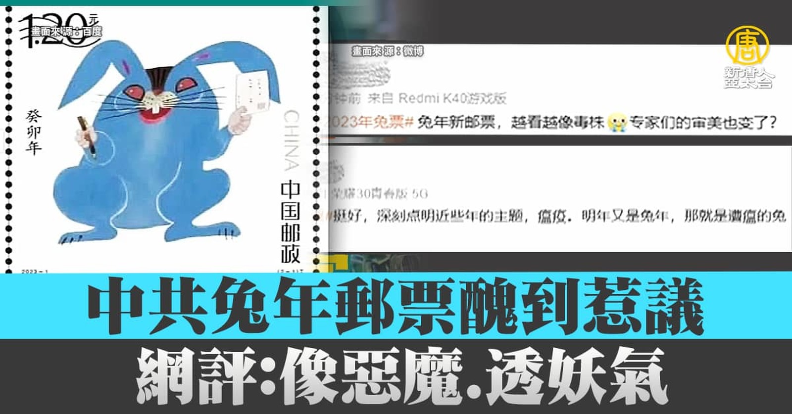 中共郵政近期公布即將發行的兔年郵票圖稿,但引來網民惡評如潮,尤其其中一隻「睿智卯兔」為藍色紅眼,有網友稱「看上去像惡魔」、「怎麼看都透露著強烈的妖氣!」、「被兔年新郵票嚇哭」,也有人諷刺點明這些年的主題:「遭瘟的兔子」。 //asset1.ntdtv.com.tw/public/uploads/assets/2022/12/28/2022-12-28-63ac3769a5d77.mp4 大白|清零|兔年郵票|日本|谷愛凌|中共官媒|202212282022-12-29 16:58:47