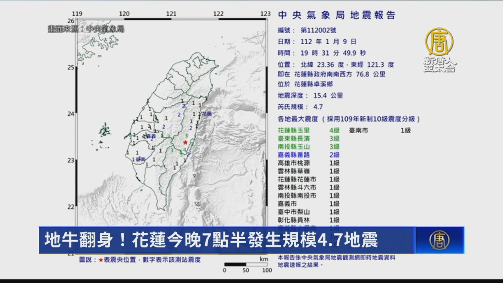 歡迎回來。地牛翻身!花蓮縣今晚7點31分,發生規模4.7地震,震央位於卓溪鄉,地震深度只有15.4公里,最大震度4級。另外各地震度花蓮4級、台東、南投3級、嘉義縣2級,全台10個縣市有震感,目前暫時沒有災情傳出。 //asset3.ntdtv.com.tw/public/uploads/assets/2023/01/09/2023-01-09-63bc0c249a947.mp4 地震|花蓮|地牛翻身|202301092023-01-09 22:05:46