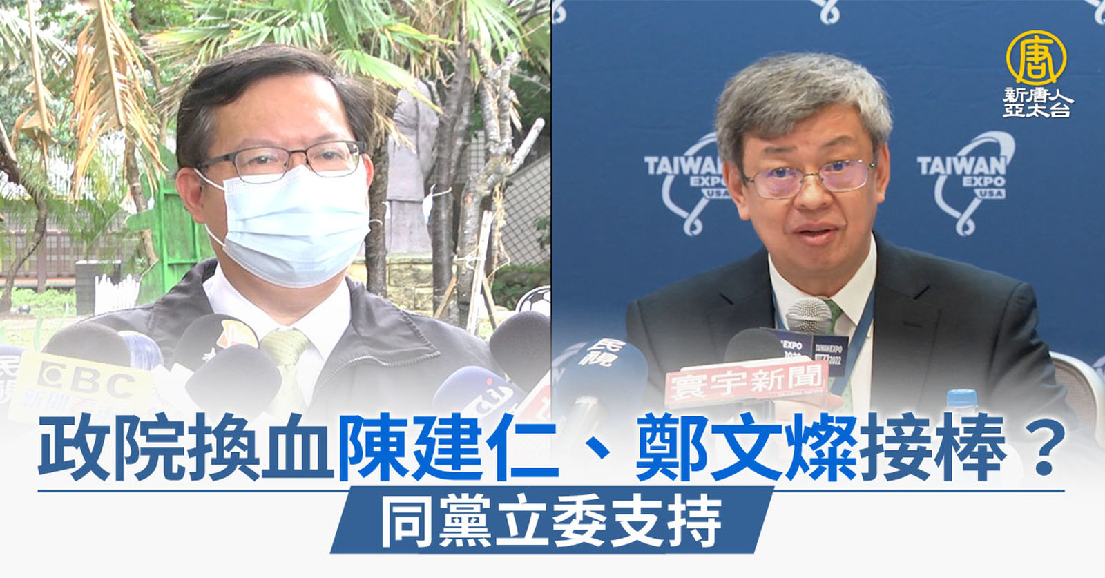 新聞首先關心,台灣內閣即將改組,傳出蘇貞昌請辭行政院長,外界揣測接任的正副人選,點名前副總統陳建仁、前桃園市長鄭文燦。今天(11日)上午,總統蔡英文與蘇貞昌在每週例會後,總統府發聲明,肯定蘇貞昌行政團隊,在變局中全力穩定經濟,並表明在立法院會期後,將討論內閣改組,若定案,將向各界報告。 //asset2.ntdtv.com.tw/public/uploads/assets/2023/01/11/2023-01-11-63bea6a89ea8d.mp4 內閣改組|蘇貞昌|陳建仁|行政院|民進黨|202301112023-01-11 21:25:06