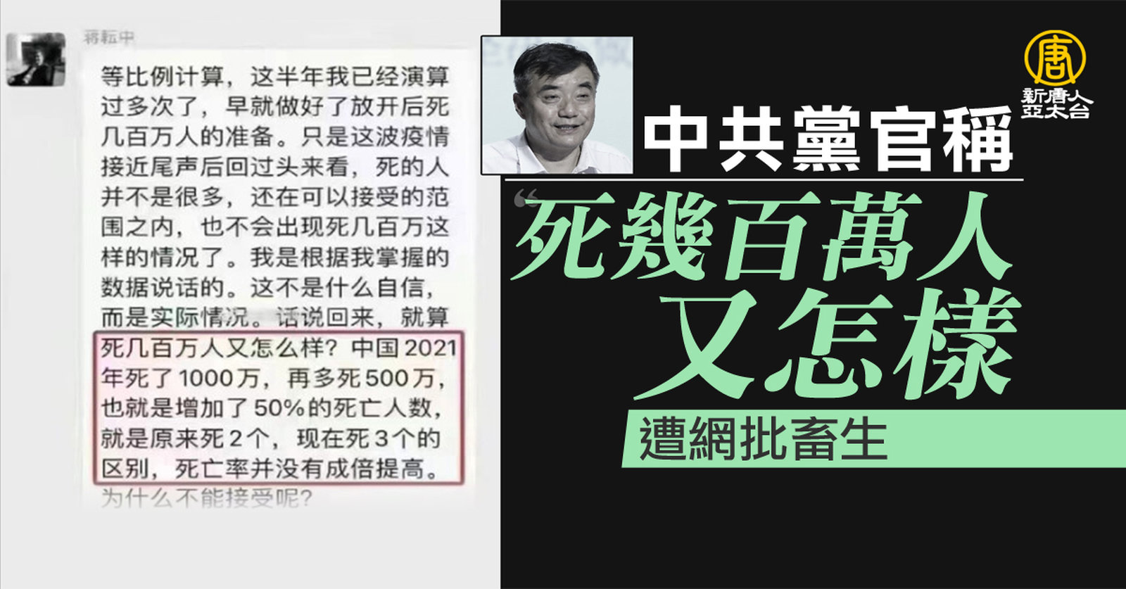 帶您來看到,中國大陸兩個月來,頻傳醫療量能不足,多地出現殯儀館外大排長龍,甚至火葬場已經難以消化大量遺體,持續有遺體排隊等待火化的情況。中共官方日前宣稱在這波疫情下,有六萬人死亡,但國際媒體並不相信,提出質疑。有自媒體人依現有可取得的資訊,認真進行估算後,表示兩個月來,中國保守估計有近3500萬人死亡。,尤其是中國大量專家與自媒體分析討論,光是從火化爐的數據推估,中國近兩個月就應有3500萬人死亡。 //asset3.ntdtv.com.tw/public/uploads/assets/2023/01/17/2023-01-17-63c6a81775fe0.mp4 中國疫情|中共病毒|中共瞞疫|死亡人數|北京疫情|202301172023-01-17 21:17:10