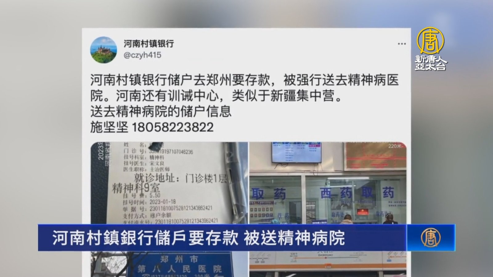 河南村鎮銀行弊案去年4月爆發後,至今仍有1000多名大額儲戶未獲官方墊付。日前有儲戶去鄭州要存款,結果被強行送到精神病醫院。 //asset3.ntdtv.com.tw/public/uploads/assets/2023/01/19/2023-01-19-63c944e38dc6d.mp4 河南村鎮銀行|儲戶|未墊付|鄭州|精神病院|202301192023-01-19 22:09:22
