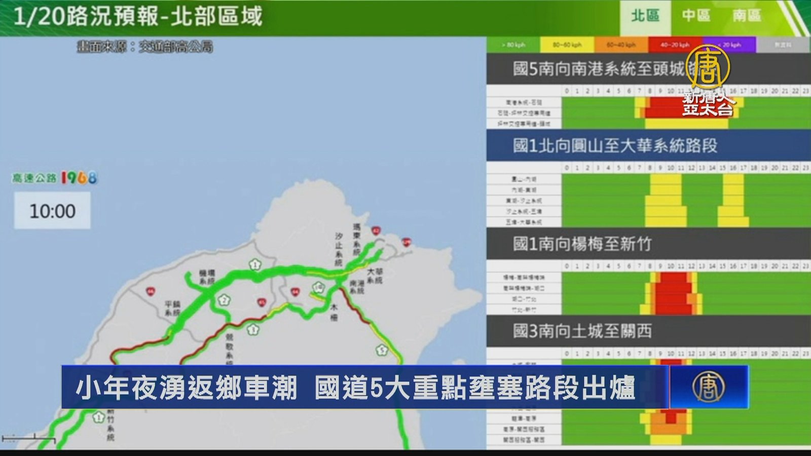 今天是小年夜,也是過年連假第一天,民眾陸續返鄉,國道湧現車潮,南向車流更是明顯,上午還出現連續多起國道事故,造成車流回堵,部分路段一度達「紫爆」狀態,車速不到20公里。明天是除夕,高公局預判南下5路段壅塞,為國1南向楊梅-新竹、彰化-埔鹽系統;國3南向土城-關西、快官-霧峰;而國5南向南港-頭城要從上午8時塞到下午4時,預估國道交通量為90百萬車公里,其中南向交通量可達52百萬車公里,為平日年平均的1.2倍。建議南向用路人儘量於下午時段出發,才不會塞在車陣中。 //asset1.ntdtv.com.tw/public/uploads/assets/2023/01/20/2023-01-20-63ca83cc12855.mp4 過年連假|返鄉車潮|紫爆|國道交通2023-01-20 20:03:49