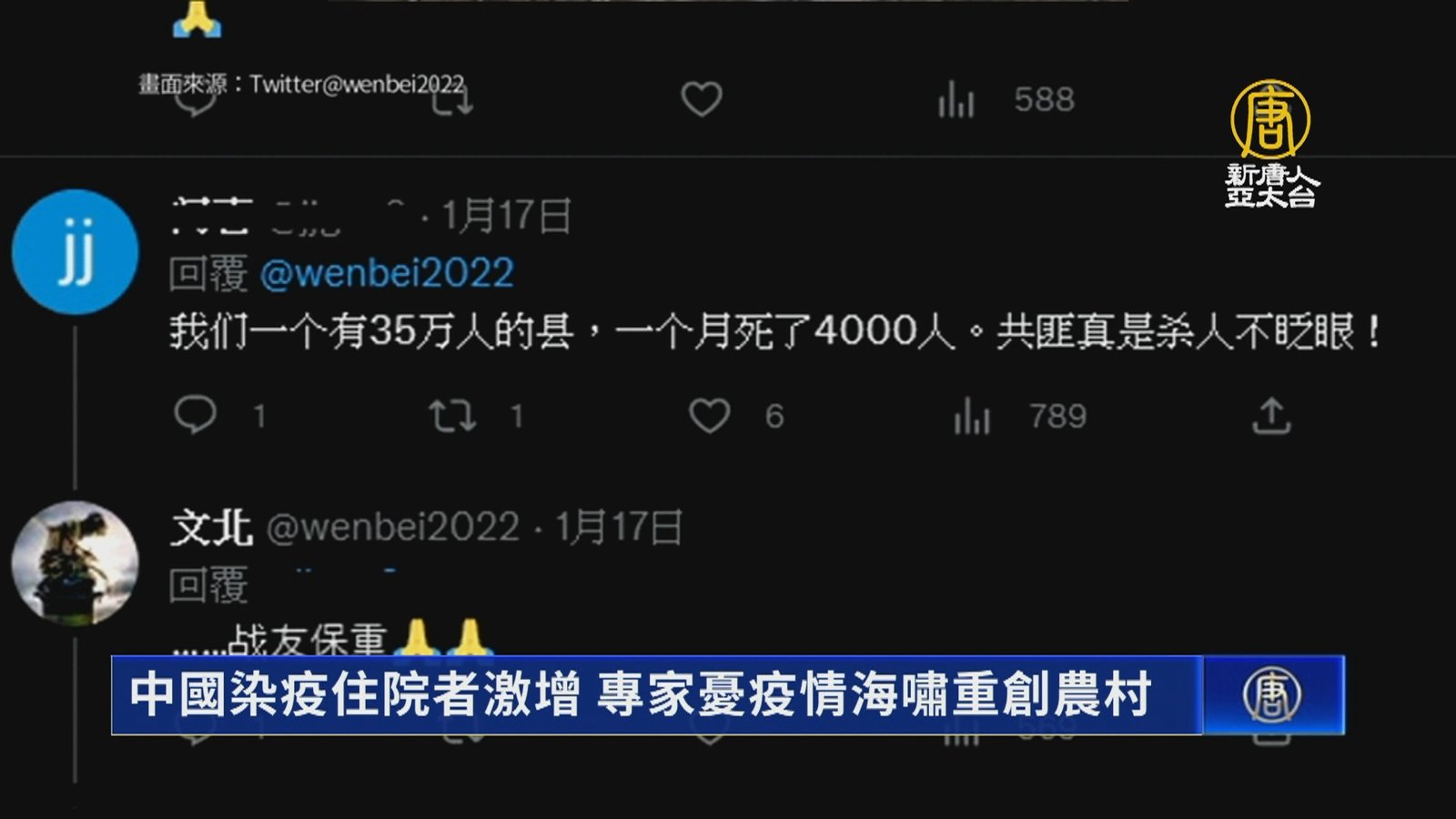 中國疫情大爆發,近期過年人潮也是大量流動,當局稱春運客流總量將達21億人。世界衛生組織表示,截至到15號,中國通報染疫住院患者激增,創下疫情爆發以來的最高峰。不過相關數據仍是被外界質疑嚴重低報,根據網路流出的資料和消息,網友表示一個村就死了200多人,也有人說,「我們一個有35萬人的縣,一個月死了4000人。共匪真是殺人不眨眼!」也有專家發表文章認為,在中國農村有大量的老年人口,卻沒有相對應的醫療量能,一場新冠海嘯正在農村醞釀。 //asset3.ntdtv.com.tw/public/uploads/assets/2023/01/20/2023-01-20-63ca884b6b7a2.mp4 中共肺炎|中共病毒|中共高官死亡2023-01-20 20:24:20