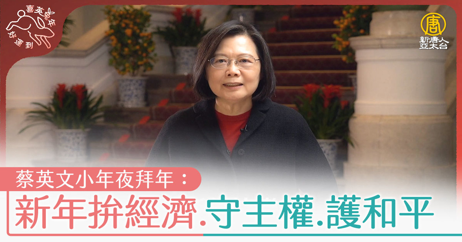 今天是小年夜,總統蔡英文特別錄製影片向國人及全世界華人朋友拜年,並感謝年假期間仍堅守崗位的各行各業夥伴。展望新的一年,總統強調執政團隊會全力以赴,積極因應疫情、全球性通膨、供應鏈重組的挑戰,並持續拼經濟、拼復甦、守主權以及護和平。 //asset3.ntdtv.com.tw/public/uploads/assets/2023/01/20/2023-01-20-63ca91a4b9e40.mp4 蔡英文|過年|小年夜|兔年行大運2023-01-20 21:05:41
