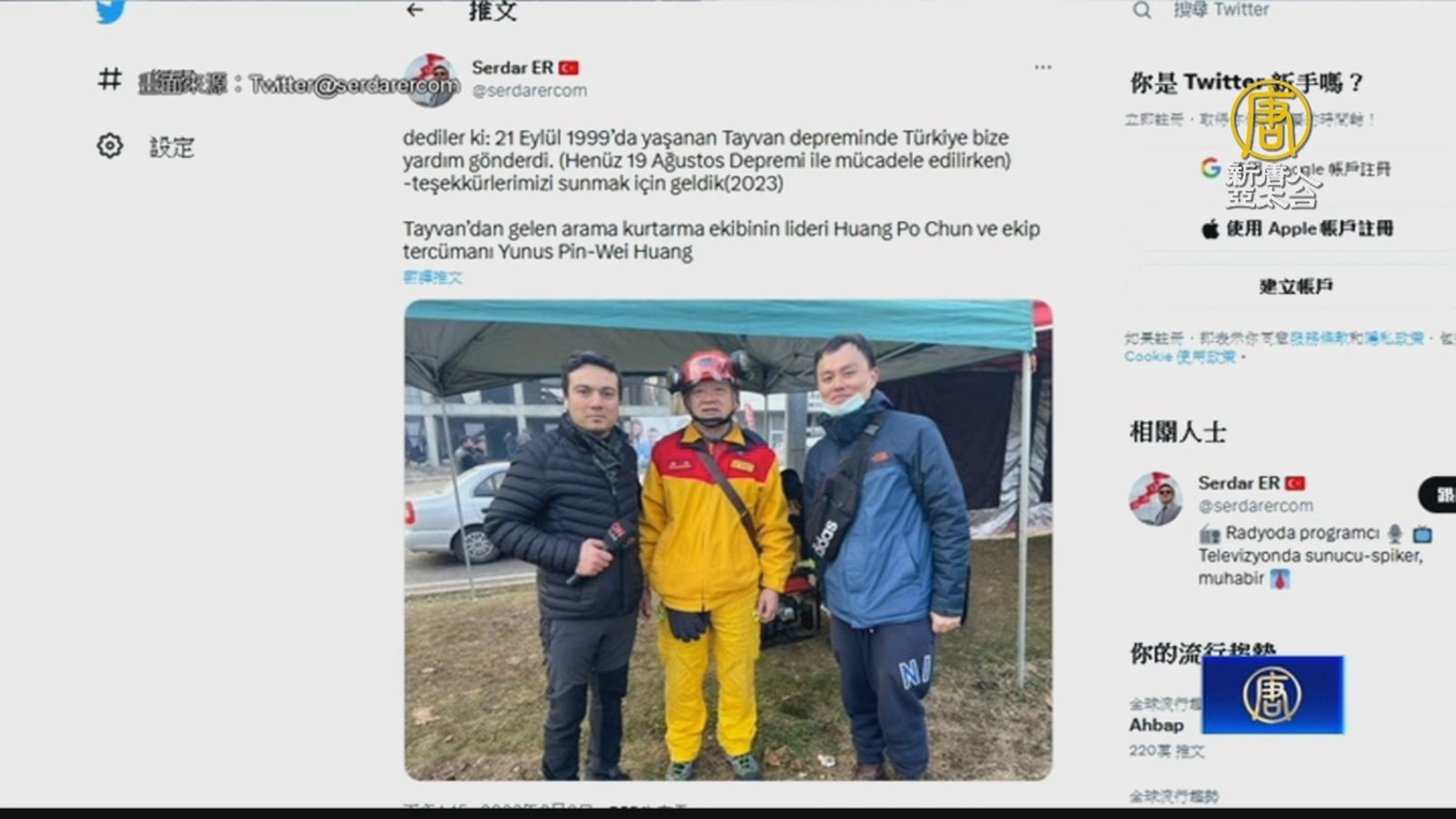 台灣派遣了130人搜救隊,進入土耳其災區搶救,並捐贈物資、金援支持災區,引起當地媒體及人民相當大關注。土耳其前總理達夫托葛魯,9日晚間在視察阿德亞曼災區時,特地向台灣搜救隊員表達感謝,他感性的說「因為你們來幫忙救援我們的公民,從現在開始,你們就是我們的公民」。當地媒體也爭相報導台灣的總統、政府官員等人士捐出薪水、以及台灣仍謹記1999年921地震土耳其參與救援,如今台灣也對土耳其伸出援手致謝。 //asset2.ntdtv.com.tw/public/uploads/assets/2023/02/10/2023-02-10-63e63410719fe.mp4 土耳其大地震|土耳其|7.8強震|國民外交|202302102023-02-10 22:13:36