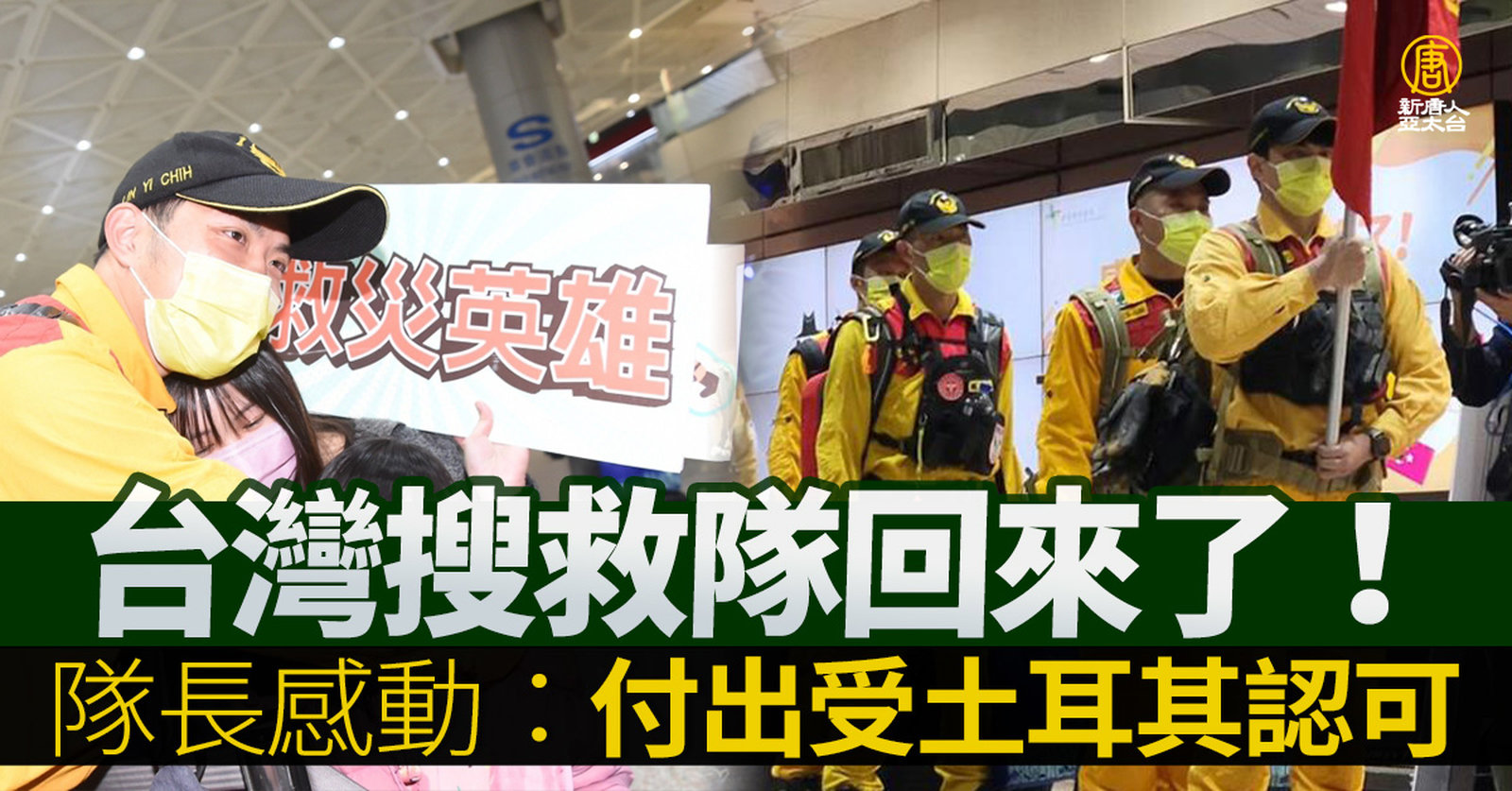 土耳其強震造成土敘兩國超過4萬人死亡,台灣國家搜救隊第一時間前往救災,歷經超過100小時任務,救出3名生還者。今天(15日)早上從土耳其返台,下午飛抵台灣,受到民眾鼓掌歡迎,許多親友趕來接機。總統蔡英文感謝搜救隊奮力營救,為兩國建立互助情誼,讓善的循環在國際延續。 //asset1.ntdtv.com.tw/public/uploads/assets/2023/02/15/2023-02-15-63eccb9d7825d.mp4 台灣搜救隊|黃博村|搜救隊|搜救犬|貝定可|吳鳳|土耳其|7.8強震|202302152023-02-15 22:09:16