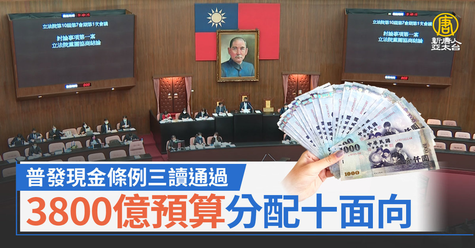 新聞首先來看到,立法院今天(21日)三讀通過「疫後特別條例」,規範超徵稅收中的新台幣3800億元用途,將會用於普發現金6,000元、學貸補助等十大面向。總統蔡英文晚間也立刻簽署公文,希望能夠加快程序,特別預算案預計周四(23日)送立法院審議。行政院副院長鄭文燦也發文,強調行政團隊會持續加緊腳步作業。 //asset3.ntdtv.com.tw/public/uploads/assets/2023/02/21/2023-02-21-63f4c25523d3f.mp4 普發現金|立法院|疫後特別條例|強化經濟|三讀|202302212023-02-21 22:05:03