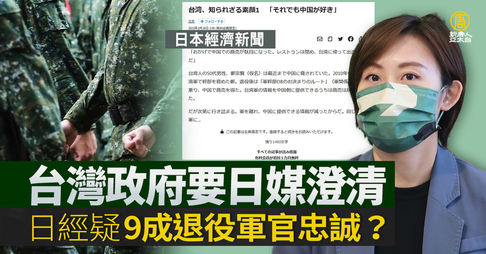 《日本經濟新聞》關注台灣安全的系列報導中,引述台灣軍方消息人士稱,9成的台灣退役軍官,會去對岸、提供情報給中共以換取金錢。中華民國外交部要求《日經》鄭重澄清,總統府對該報導表示遺憾,喊話全體國人支持國軍。 //asset1.ntdtv.com.tw/public/uploads/assets/2023/03/02/2023-03-02-640096d626b89.mp4 日經|國軍|忠誠|情報2023-03-02 20:25:19