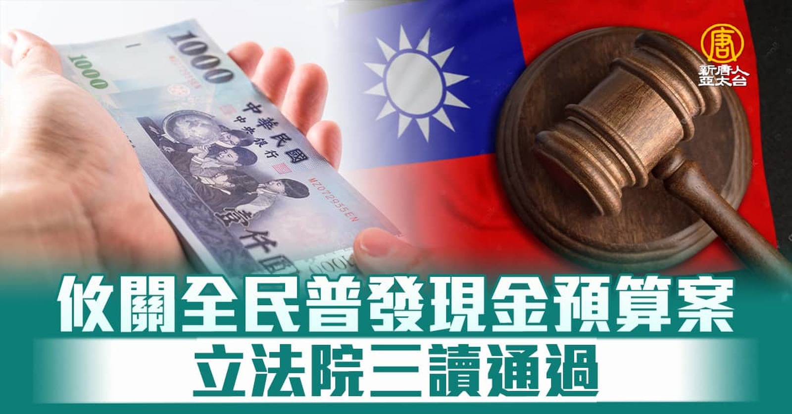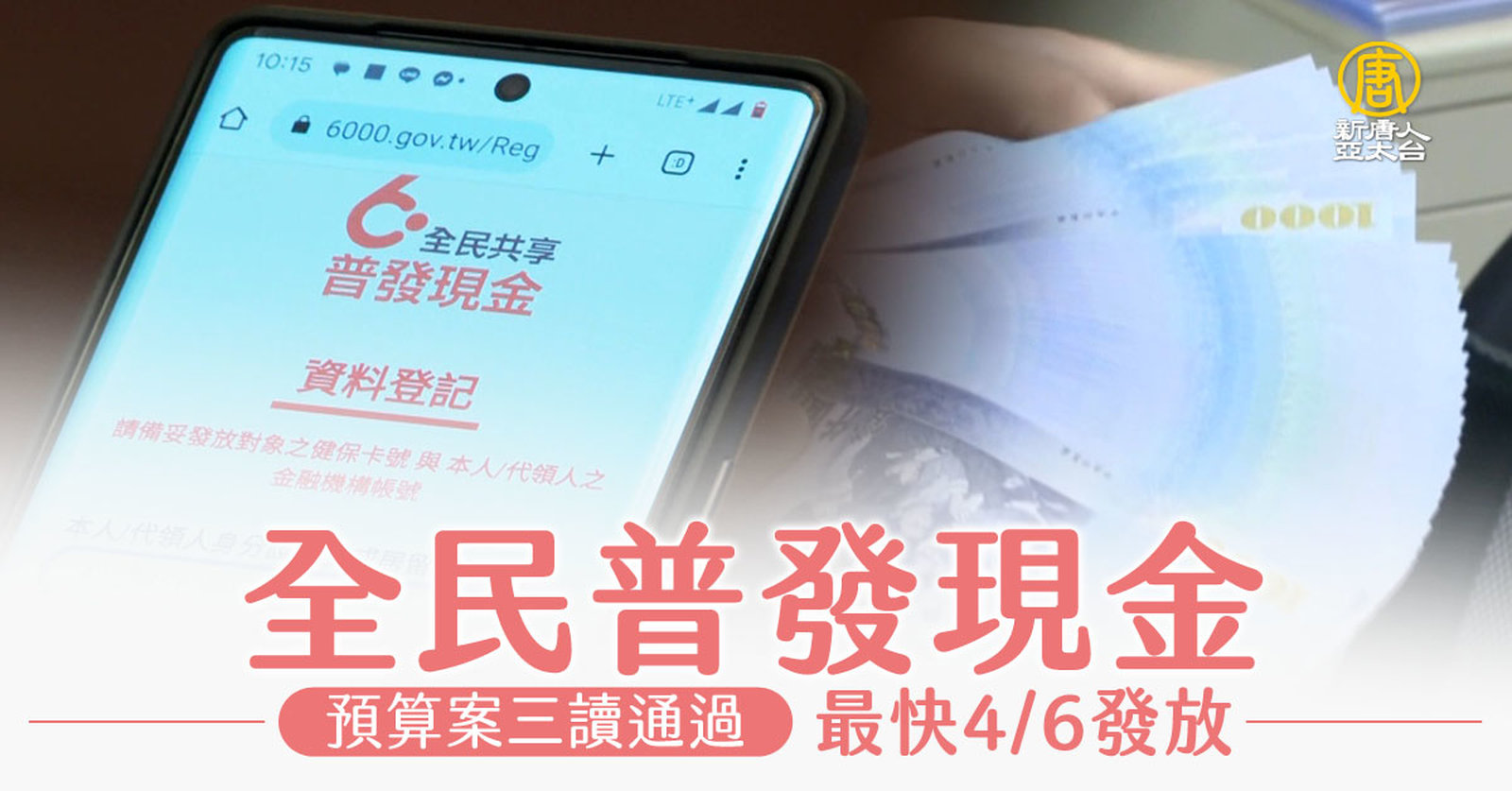 台灣立法院今天三讀通過,攸關全民普發現金的疫後特別預算案,規模近3800億元,其中包括普發現金1417億元。預計三讀之後再經總統公布,下週生效,總統蔡英文今天(24日)在臉書發文,感謝立法院朝野政黨,表示會盡快進行相關程序,盡快落實。行政院長陳建仁也發文表達感謝。表示特別預算讓政府可投入疫後復甦,照顧全民。弱勢族群直接入帳、偏鄉造冊發放,以及首批完成登記入帳的民眾,4月6日就能領到6000元。 //asset1.ntdtv.com.tw/public/uploads/assets/2023/03/24/2023-03-24-641d95b718871.mp4 普發現金|立法院三讀2023-03-24 20:51:24