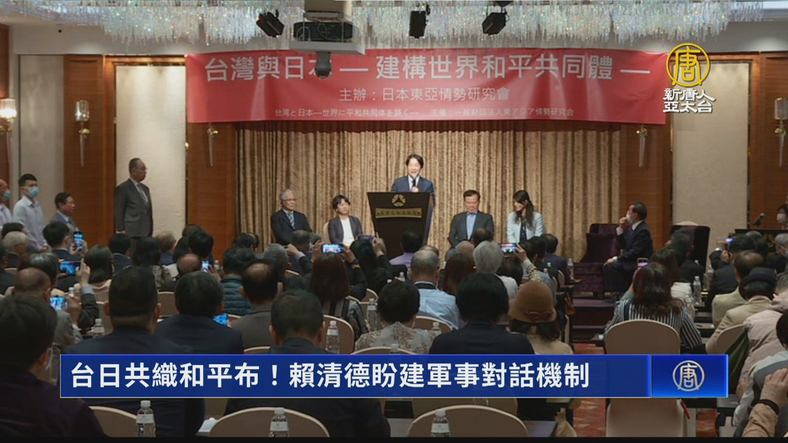 新聞一開始,先帶您關心,副總統賴清德今天(24日)出席「台日建構世界和平共同體」座談表示,面對極權主義擴張,台日脣亡齒寒、是命運共同體,不得不合作,希望雙方建立軍事對話機制,維護和平。 //asset1.ntdtv.com.tw/public/uploads/assets/2023/03/24/2023-03-24-641da059c10ef.mp4 台日友好|賴清德|謝長廷2023-03-24 21:06:34