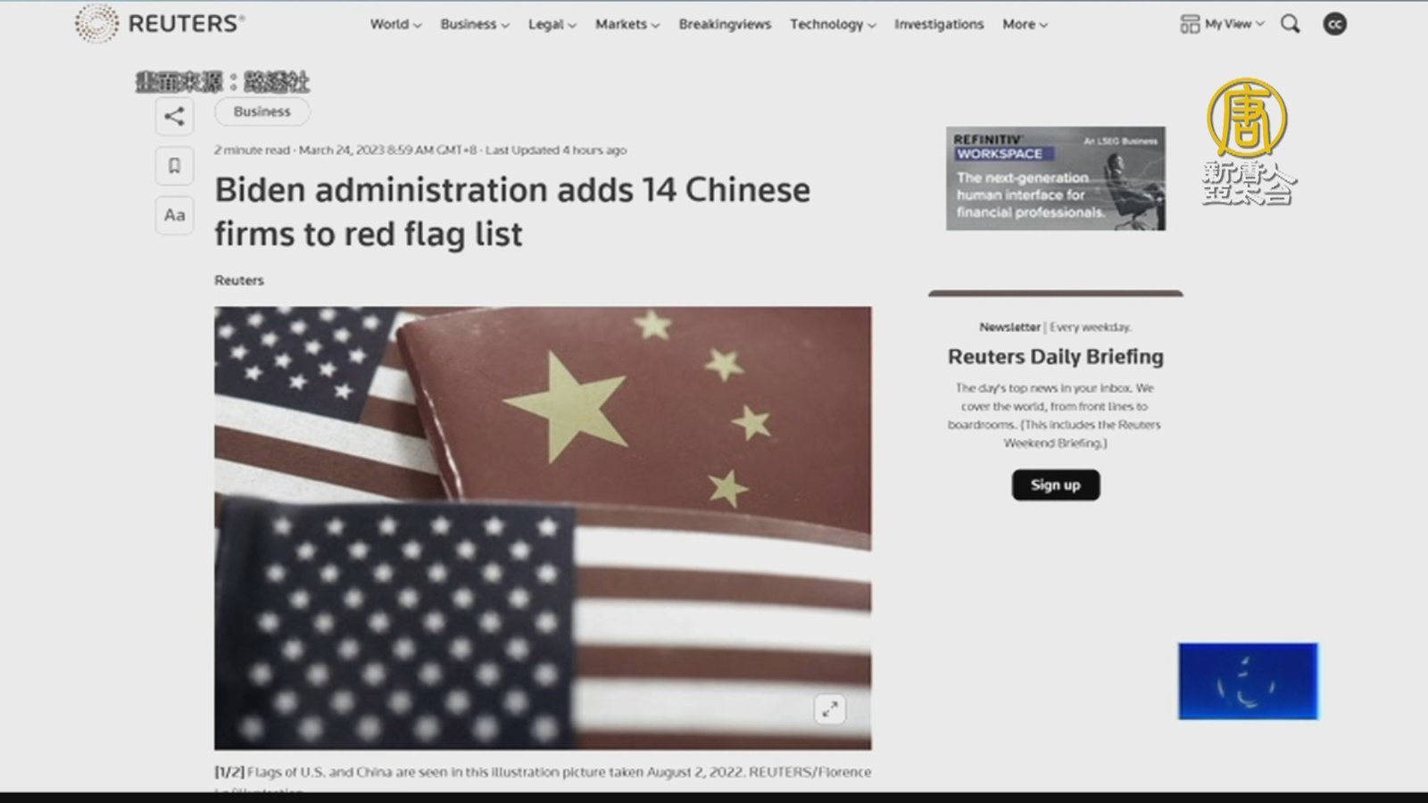 歡迎回來。美中科技角力,23號,拜登政府將14家中國企業列入紅色警戒清單,強制美國出口商在向這些企業發貨前,進行更審慎的調查,因為美國官員一直無法查核列這些實體,其中包括在香港註冊的兩家公司。路透社報導,被列入清單可能將啟動為期60天的時限,可能會引發更嚴厲的懲罰措施。美國商務部副部長葛瑞夫茲發聲明表示:「實施出口管制是保護美國國家安全的重要部分。我們致力運用我們手上所有的工具,來查明美國先進科技在全球各地的使用狀況。」 //asset3.ntdtv.com.tw/public/uploads/assets/2023/03/24/2023-03-24-641d97c57bc67.mp4 中國|美國|貿易2023-03-24 20:26:29